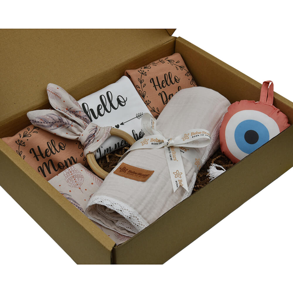 Βρεφικό σετ δώρου στην απόχρωση της τερακότας από την εταιρεία Bebe Stars. Περιλαμβάνει 3 κοντομάνικα φορμάκια μεγέθους 0-3 μηνών με τύπωμα Hello mom, Hello dad και Hello I’m new here, 1 απαλή πάνα μουσελίνα για να τυλίγετε το μωρό σας, 1 σαλιάρα διπλής όψης, 1 μασητικό και 1 κρεμαστό μαξιλαράκι με σχέδιο ματάκι. Πληροί τα πρότυπα της ΕΕ και δεν περιέχει επιβλαβείς ουσίες. Έρχεται σε συσκευασία κουτί που το καθιστά ιδανικό για δώρο.