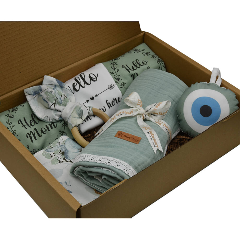 Βρεφικό σετ δώρου σε βεραμάν χρώμα από την εταιρεία Bebe Stars. Περιλαμβάνει 3 κοντομάνικα φορμάκια μεγέθους 0-3 μηνών με τύπωμα Hello mom, Hello dad και Hello I’m new here, 1 απαλή πάνα μουσελίνα για να τυλίγετε το μωρό σας, 1 σαλιάρα διπλής όψης, 1 μασητικό και 1 κρεμαστό μαξιλαράκι με σχέδιο ματάκι. Πληροί τα πρότυπα της ΕΕ και δεν περιέχει επιβλαβείς ουσίες. Έρχεται σε συσκευασία κουτί που το καθιστά ιδανικό για δώρο.
