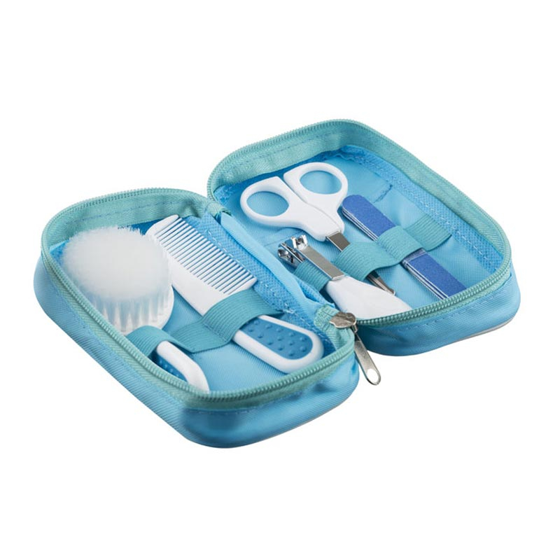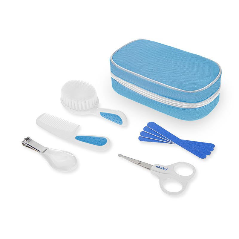 Σετ περιποίησης μωρού σε γαλάζιο χρώμα από την εταιρία Akuku. Το σετ περιλαμβάνει ένα ψαλιδάκι με στρογγυλεμένες άκρες για να κόβετε με ασφάλεια τα νυχάκια του, έναν νυχοκόπτη, λίμες νυχιών, μία μαλακή βούρτσα μαλλιών και μία χτένα μαλλιών με αντιολισθητική λαβή. Το σετ έρχεται μέσα σε μία πρακτική θήκη που θα σας εξυπηρετήσει και για τα ταξίδια σας.