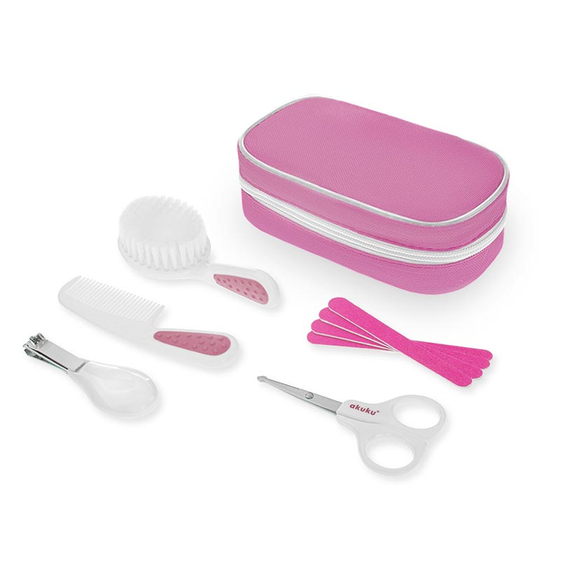 Σετ περιποίησης μωρού σε ροζ χρώμα από την εταιρία Akuku. Το σετ περιλαμβάνει ένα ψαλιδάκι με στρογγυλεμένες άκρες για να κόβετε με ασφάλεια τα νυχάκια του, έναν νυχοκόπτη, λίμες νυχιών, μία μαλακή βούρτσα μαλλιών και μία χτένα μαλλιών με αντιολισθητική λαβή. Το σετ έρχεται μέσα σε μία πρακτική θήκη που θα σας εξυπηρετήσει και για τα ταξίδια σας.