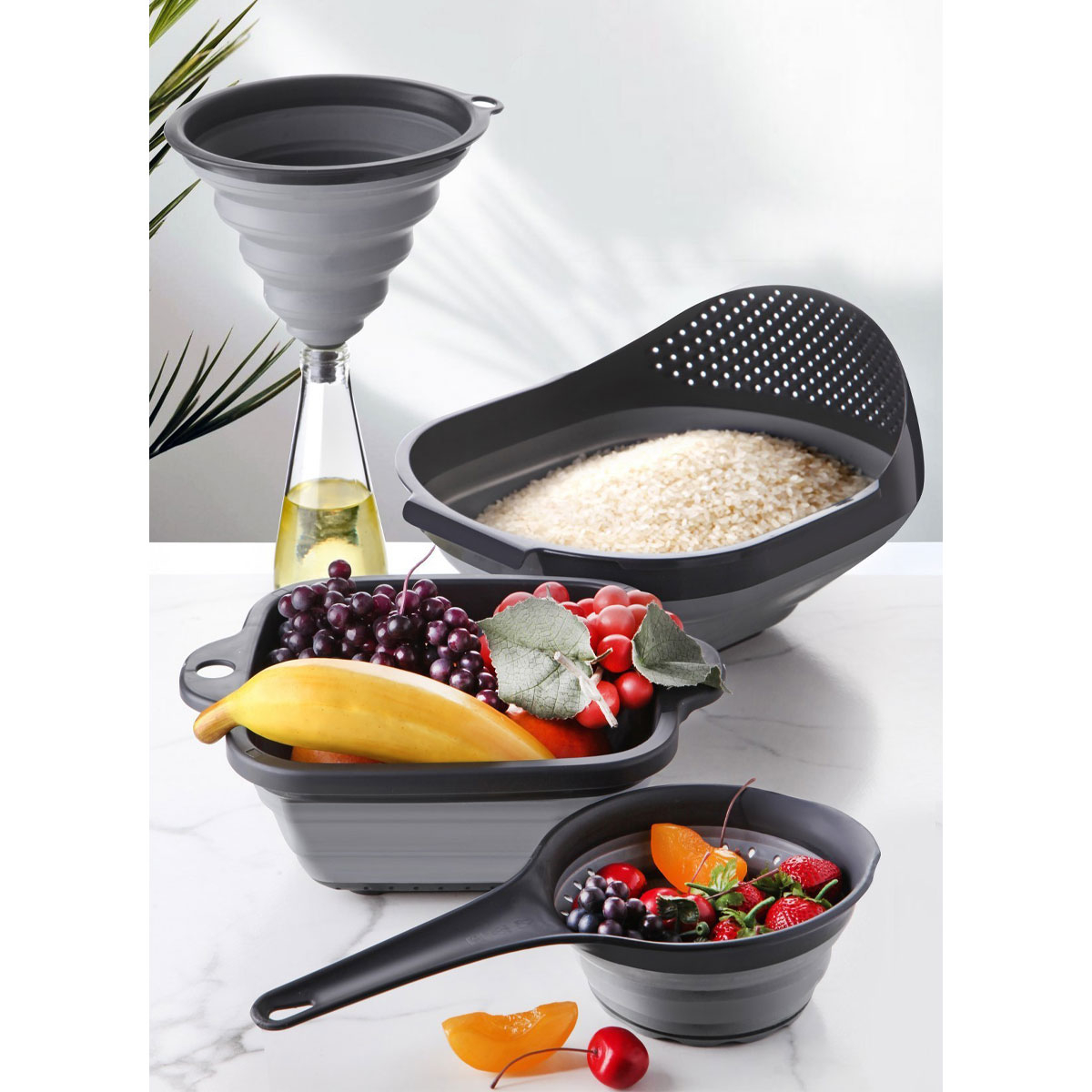 Εργαλεία κουζίνας σε σετ 4 τεμαχίων, κατασκευασμένα από ανθεκτικό πλαστικό υλικό απαλλαγμένο από BPA. Το σετ περιλαμβάνει: 1 σουρωτήρι με λαβή, 2 σουρωτήρια κατσαρόλας και ένα χωνί για μπουκάλια και δοχεία. Είναι όλα πτυσσόμενα, ώστε να μην πιάνουν χώρο κατά την αποθήκευση. Απαραίτητο σετ για κάθε κουζίνα.