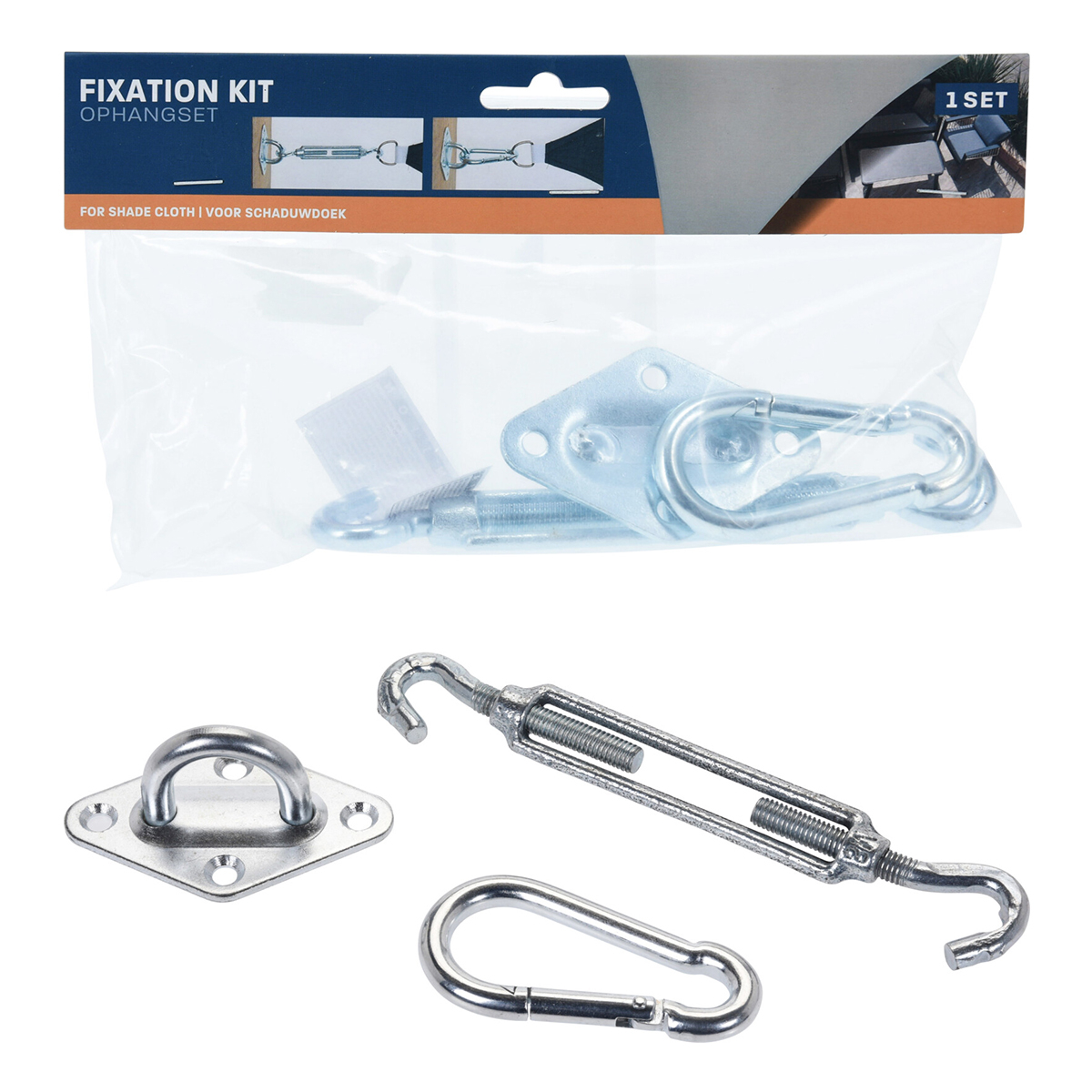Σετ 3 τεμαχίων για στερέωση σκίαστρου. Είναι η ιδανική λύση για την ασφαλή και σταθερή τοποθέτηση σκιάστρων και τεντών τύπου "shade cloth" ή "sail shade". Κατάλληλα για τοποθέτηση σε τοίχους, μπαλκόνια, ξύλινες ή μεταλλικές επιφάνειες που εξασφαλίζουν αντοχή και προστασία από τον άνεμο. Το σετ περιλαμβάνει 1 τεντωτήρα με γάντζους που ρυθμίζει την τάση στο σκίαστρο, ώστε να παραμένει τεντωμένο και σταθερό, 1 Carabiner clip που επιτρέπει την εύκολη και γρήγορη σύνδεση και αποσύνδεση του σκίαστρου και 1 πλάκα στήριξης με κρίκο που στερεώνεται σε σταθερή επιφάνεια και λειτουργεί ως σημείο αγκύρωσης.