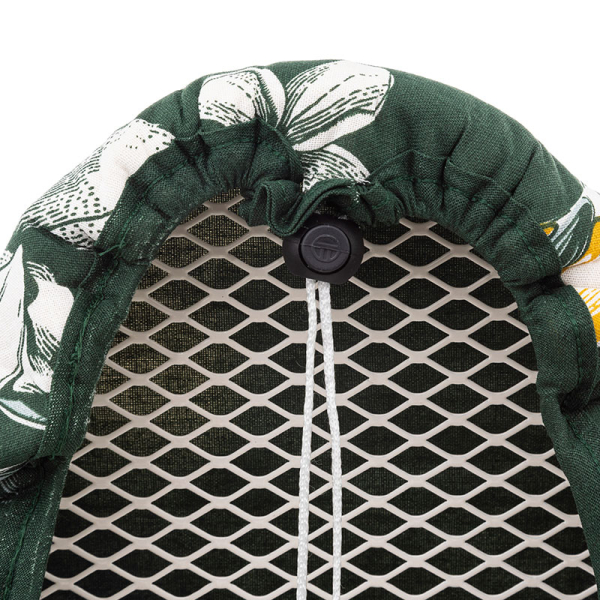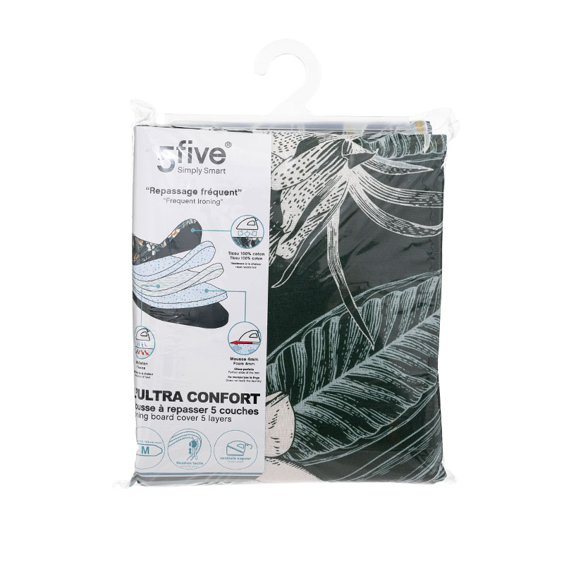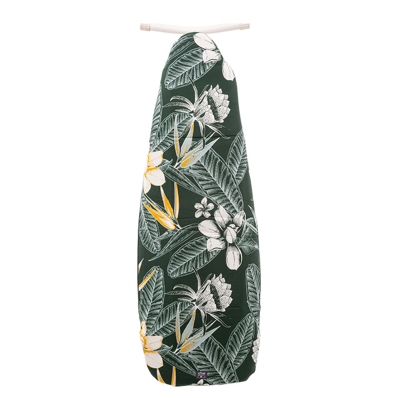Κάλυμμα σιδερώματος από βαμβακερό ύφασμα σε πράσινο χρώμα με tropical σχέδιο και λευκές - κίτρινες λεπτομέρειες. Ιδιαίτερα παχύ σιδερόπανο με 5 στρώσεις για βελτιστοποιημένη άνεση και απόδοση σιδερώματος. Έχει κορδόνι σύσφιξης με κλιπ ελατηρίου για να εφαρμόζει πλήρως στη σιδερώστρα. Συμβατό με σιδερώστρες μεταξύ 115εκ.Μx45εκ.Π και 125εκ.Μx45εκ.Π. Πάχος 1cm.