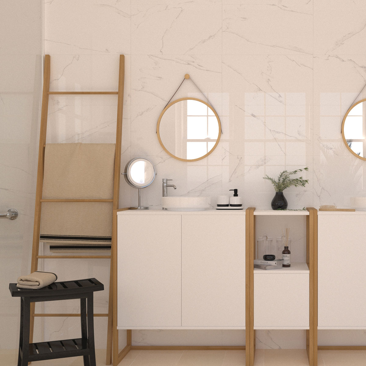 Κρεμάστρα σε μορφή σκάλας κατασκευασμένο από ξύλο μπαμπού σε φυσική απόχρωση. Διαθέτει 5 σκαλιά κρεμάσματος και 2 γάντζους για να κρεμάτε πετσέτες, ρούχα, κλπ. Απλά την στηρίζετε στον τοίχο χωρίς τρύπημα και βίδες, κι άρα μπορείτε να την μεταφέρετε όπου και όποτε θέλετε.
