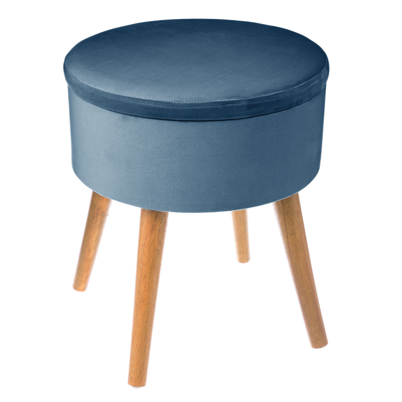 Σκαμπό σε μπλε χρώμα που θα προσφέρει μία έξτρα θέση στο χώρο σας. Το κάθισμα είναι κατασκευασμένο από πολυεστερικό βελουτέ ύφασμα με αφρό πολυουρεθάνης και σκελετό MDF, ενώ τα πόδια είναι από ξύλο πεύκου σε φυσική απόχρωση. Αν αφαιρέσετε το καπάκι του καθίσματος θα δείτε τον αποθηκευτικό χώρο, που είναι ιδανικός για να τοποθετήσετε μικροπράγματα. Το προϊόν έρχεται αμοντάριστο και συναρμολογείται βάσει οδηγιών. Μέγιστο βάρος αντοχής: 110 κιλά.