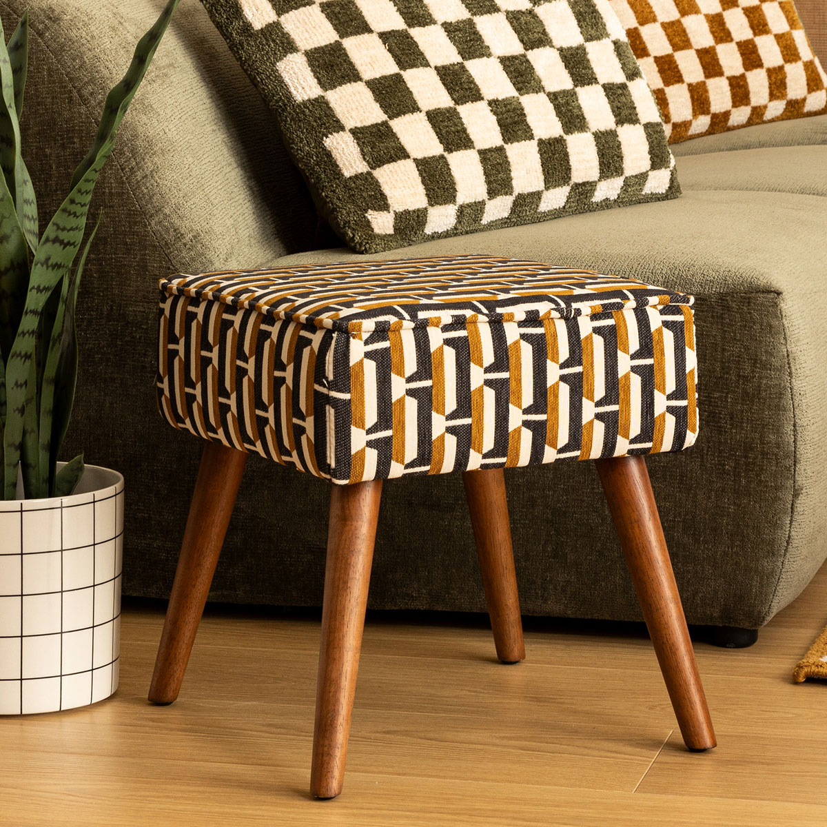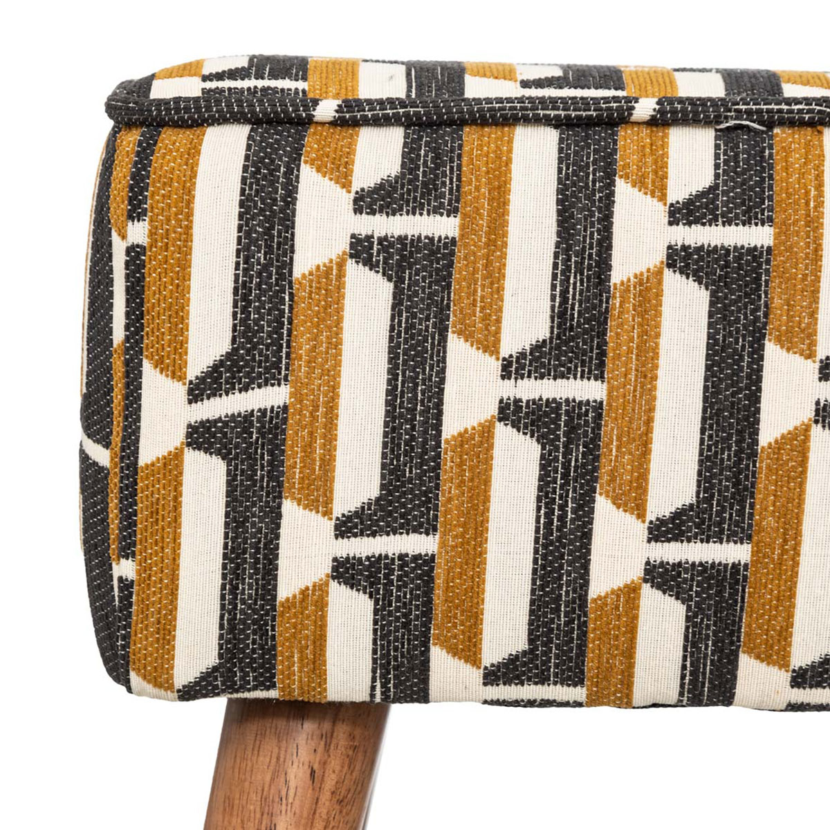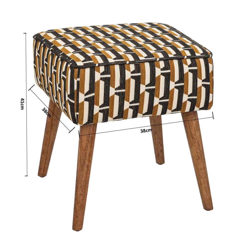 Σκαμπό με μοντέρνο ύφος που θα προσφέρει ένα έξτρα κάθισμα στο χώρο σας. Ο σκελετός είναι κατασκευασμένος από μοριοσανίδα_Ε1 σε καφέ χρώμα. Το κάθισμα είναι από 100% polyester σε γκρι, λευκό και στο χρώμα της ώχρας με εμπριμέ σχέδιο ενώ η γέμιση είναι από αφρό πολυουρεθάνης. Ιδανικό σκαμπό που θα ταιριάξει σε κάθε σπίτι. *Το προϊόν έρχεται αμοντάριστο και συναρμολογείται βάσει οδηγιών.*