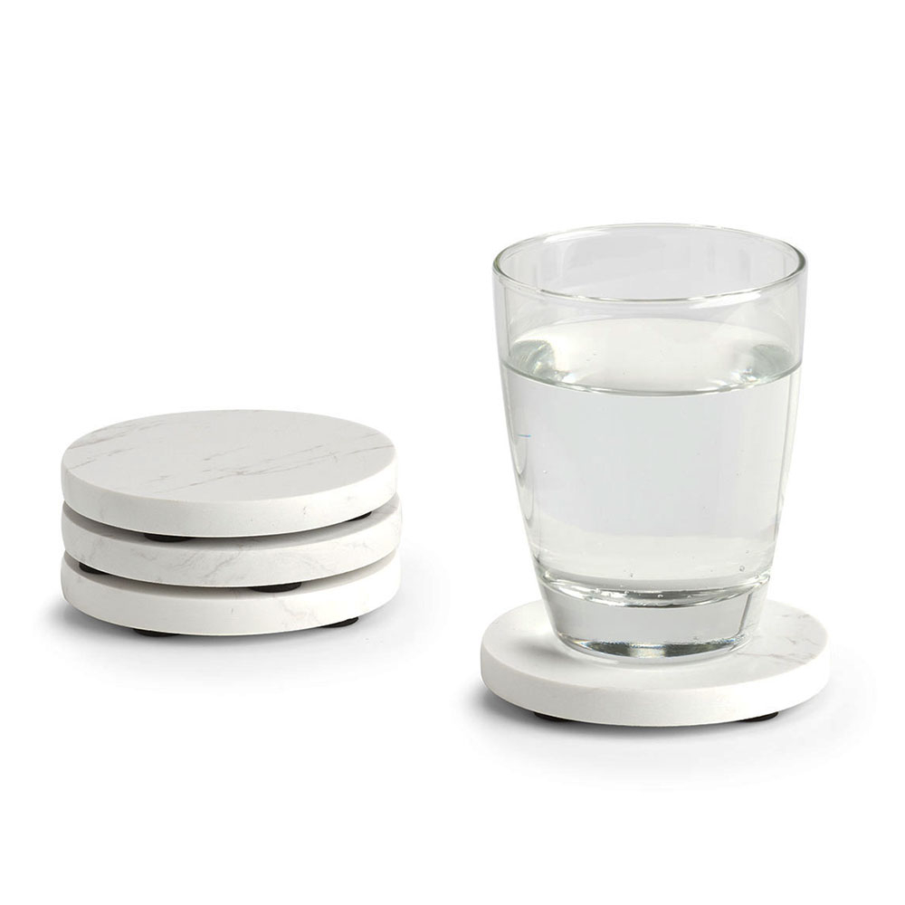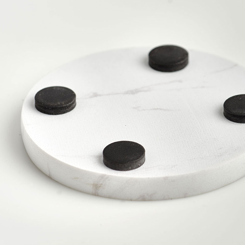 Στρογγυλά σουβέρ σετ 4 τεμαχίων κατασκευασμένα από μάρμαρο σε λευκό χρώμα. Τα σουβέρ διαθέτουν προστατευτικά στοχάκια στο κάτω μέρος για να μην γρατζουνάνε τις επιφάνειες σας. Αποκτήστε σουβέρ για να προστατεύσετε τις επιφάνειες του τραπεζιού σας.