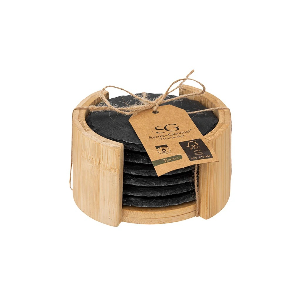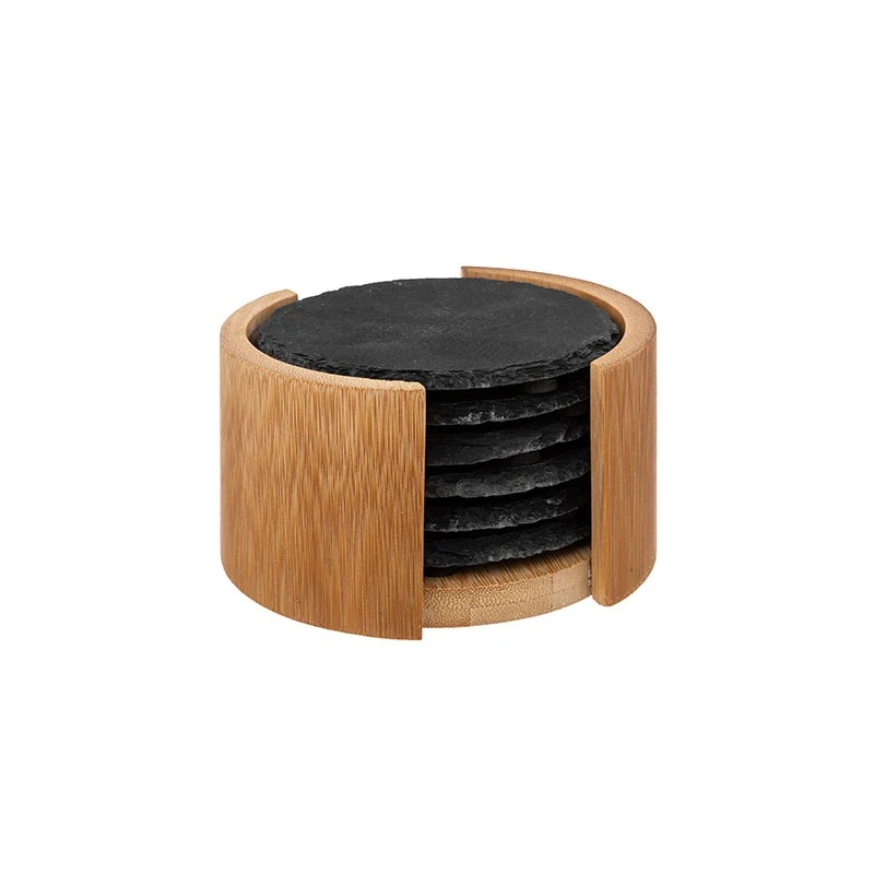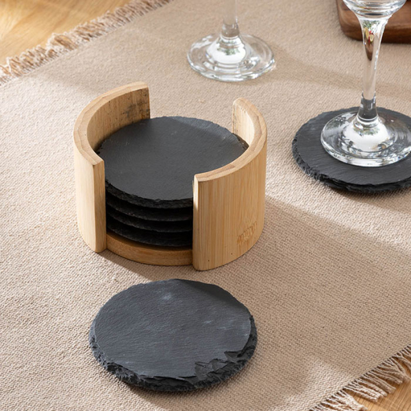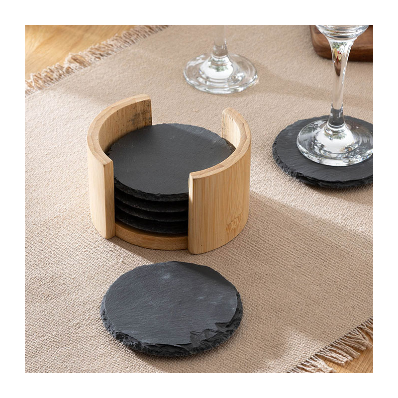 Σουβέρ σε μαύρο χρώμα και μοντέρνο σχεδιασμό. To σετ περιέχει 6 πέτρινα σουβέρ καθώς και θήκη τοποθέτησης κατασκευασμένη από bamboo σε φυσικό χρώμα. Επιλέξτε εντυπωσιακά σουβέρ για να προστατεύσετε τις επιφάνειες του τραπεζιού σας.