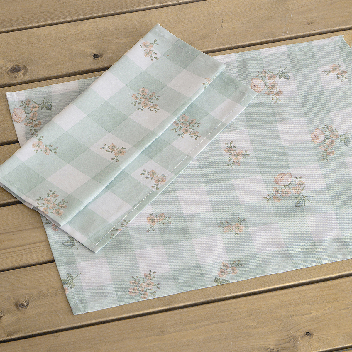 Σετ σουπλά της εταιρείας Nima σε βεραμάν και λευκό χρώμα. Έχουν καρό σχέδιο με ροζ φλοράλ λεπτομέρειες. Η σύνθεσή τους είναι 100% βαμβάκι. Προστατεύουν το τραπέζι σας από τυχόν λεκέδες κατά την διάρκεια του φαγητού. Συνδυάστε τα με τα υπόλοιπα προϊόντα της συλλογής για ένα ολοκληρωμένο αποτέλεσμα.