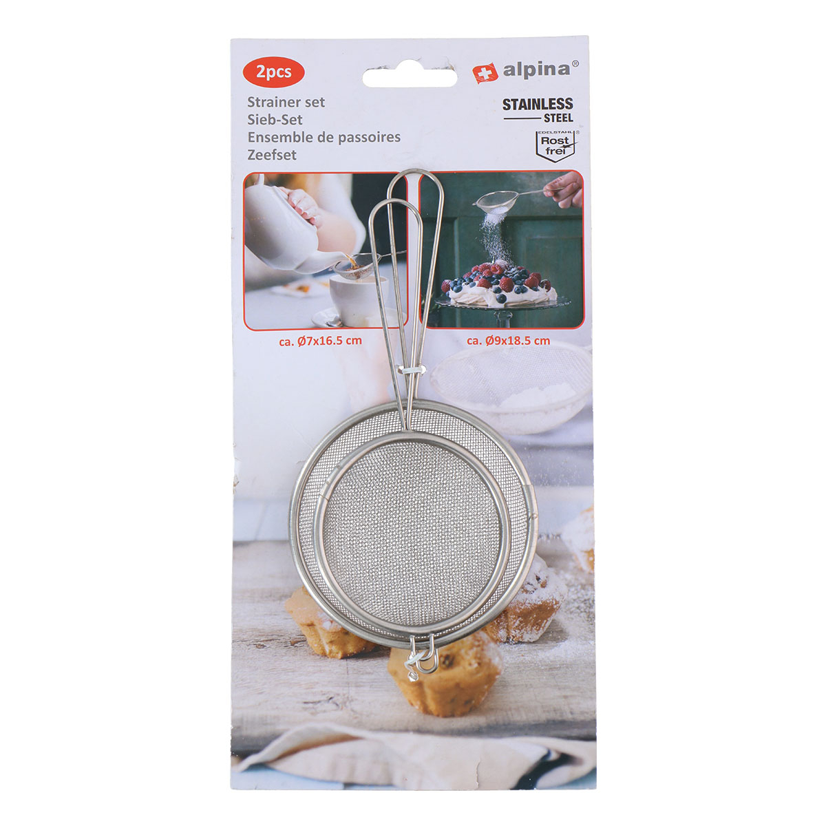 Σουρωτήρια σε σετ από την εταιρία Alpina. Το σετ περιλαμβάνει 2 σουρωτήρια διαφορετικών μεγεθών. Είναι κατασκευασμένα από ανοξείδωτο ατσάλι σε ασημί χρώμα. Διαθέτουν τρύπα για να κρεμιούνται. Ιδανικό εργαλείο για να φιλτράρετε υγρά ή για να κοσκινίζετε.