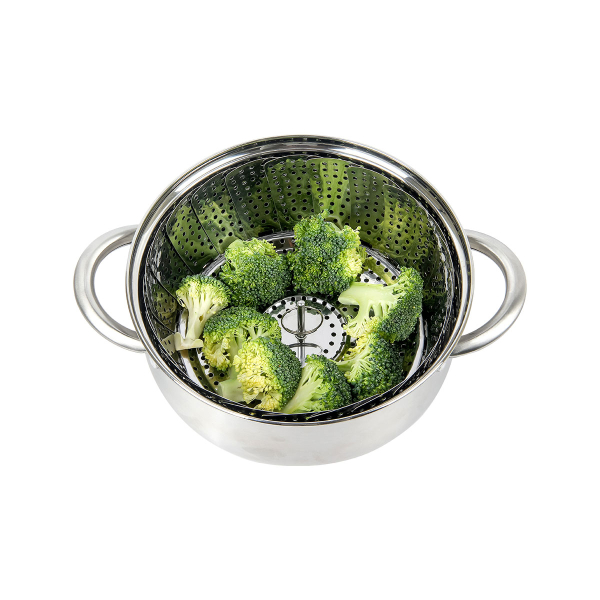 Καλάθι για μαγείρεμα στον ατμό από την εταιρεία εstia. Είναι ανθεκτικό χάρη στην κατασκευή του από ανοξείδωτο ατσάλι. Τοποθετήστε το πάνω από μία κατσαρόλα με βραστό νερό και στο πάνω μέρος τοποθετήστε τα λαχανικά. Κλείνει για να πιάνει λιγότερο όγκο κατά την αποθήκευση. Είναι κατάλληλο για κατσαρόλες με διάμετρο μέχρι 24εκ.