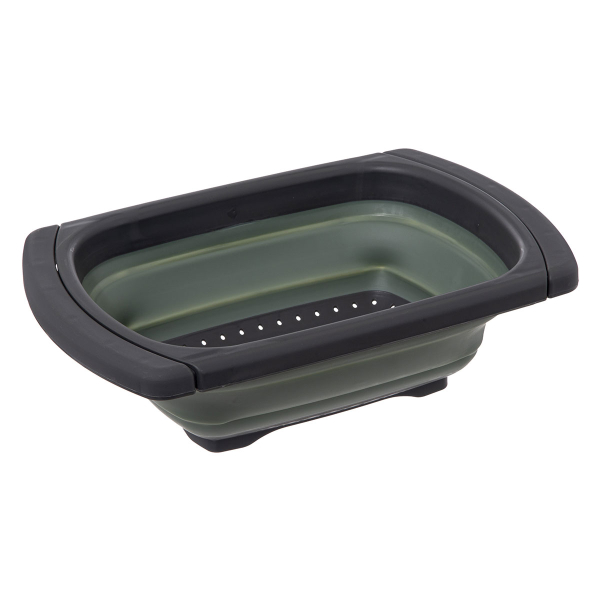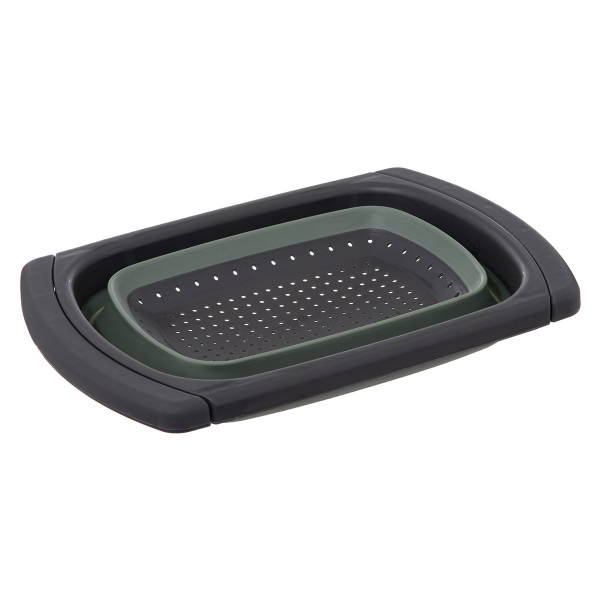 Πτυσσόμενο σουρωτήρι σε γκρι αποχρώσεις. Είναι κατασκευασμένο από πλαστικό υλικό και διαθέτει 2 χερούλια τα οποία επεκτείνονται ώστε να μπορείτε να το στηρίξετε στον νεροχύτη σας, ανεξάρτητα από το μέγεθός του. Είναι πτυσσόμενο για να το αποθηκεύεται όταν δεν το χρησιμοποιείται και να καταλαμβάνει ελάχιστο χώρο. Ιδανικό εργαλείο για κουζίνες με περιορισμένο χώρο.