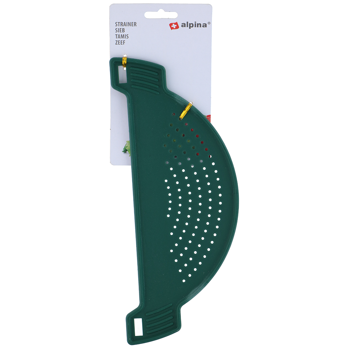 Σουρωτήρι κατσαρόλας από την εταιρεία Alpina. Είναι κατασκευασμένο από πλαστικό υλικό κατάλληλο για τρόφιμα, σε πράσινο χρώμα. Απλά τοποθετήστε το στην άκρη της κατσαρόλας για να απομακρύνεται τα υγρά. Ο σχεδιασμός του το καθιστά ιδανικό για να μπορεί να αποθηκεύεται εύκολα όταν δεν χρησιμοποιείται. Ιδιαίτερα πρακτικό εργαλείο για την καθημερινή μαγειρική, κάνοντάς την πιο εύκολη.