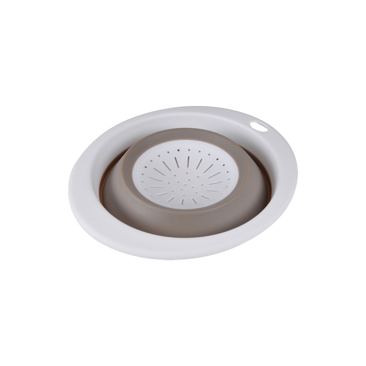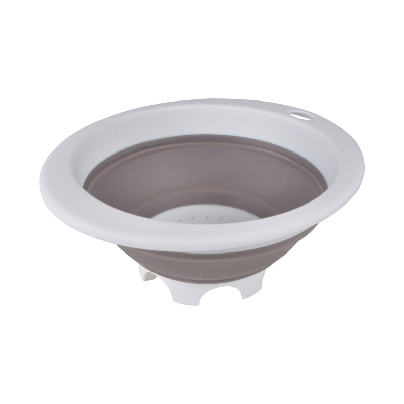 Σουρωτήρι λευκό χρώμα και μπεζ λεπτομέρεια. Είναι κατασκευασμένο από πλαστικό υλικό κατάλληλο για τρόφιμα και είναι πτυσσόμενο ώστε να μπορεί να αποθηκεύεται εύκολα. Απαραίτητο για το πλύσιμο των λαχανικών ή για να σουρώσετε τα ζυμαρικά σας.