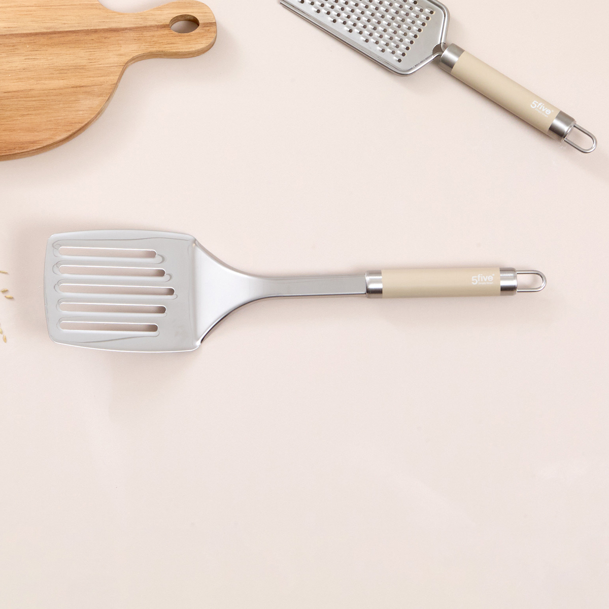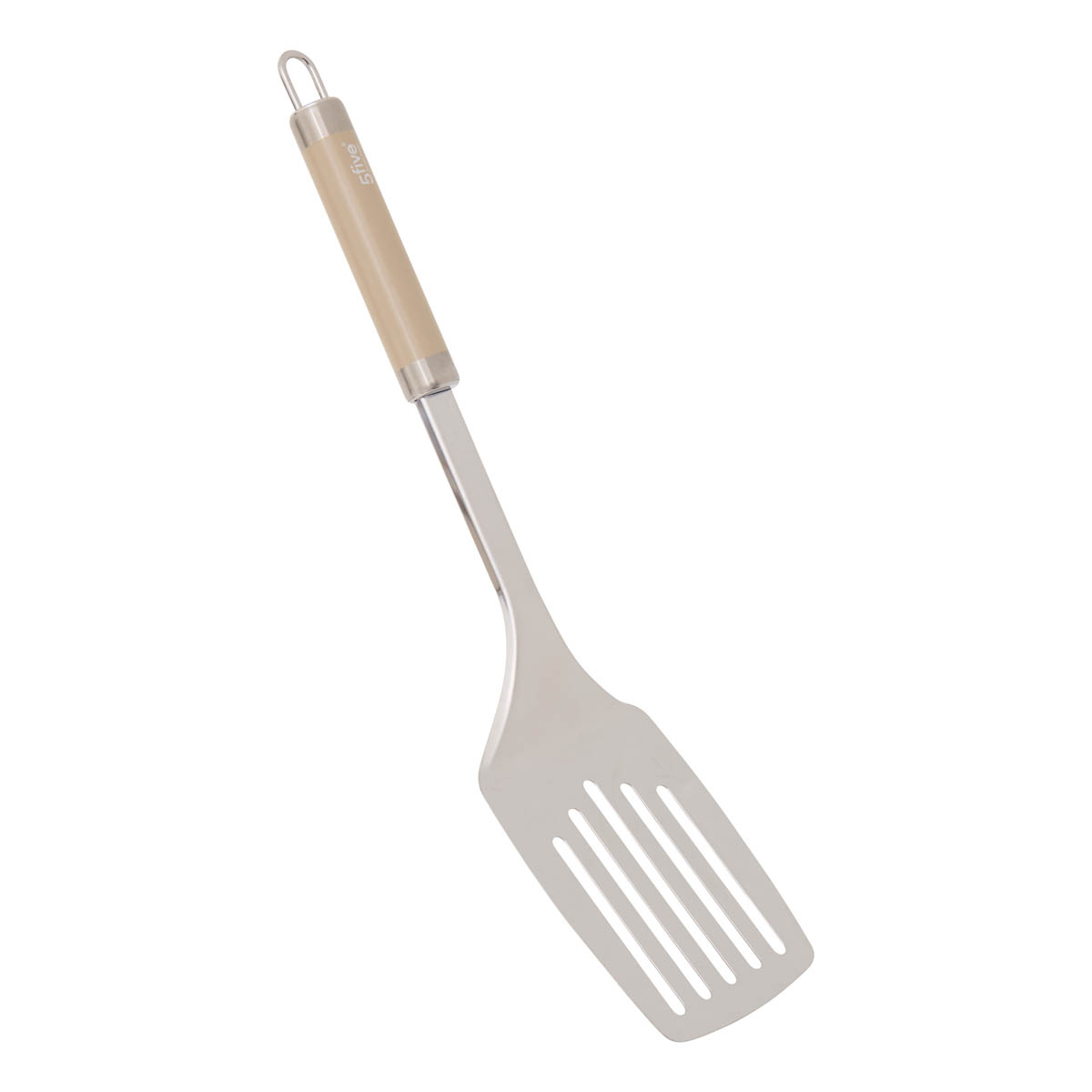 Σπάτουλα τρυπητή κατασκευασμένη από ανοξείδωτο υλικό σε μοντέρνο μπεζ χρώμα. Απαραίτητο και πρακτικό εργαλείο κουζίνας για καθημερινή χρήση, που διευκολύνει το μαγείρεμα.