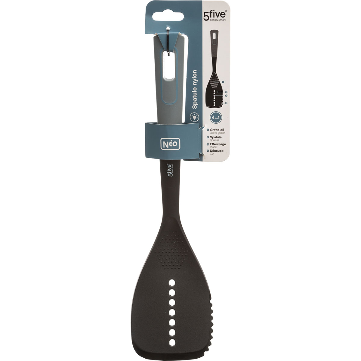 Σπάτουλα τρυπητή σε μαύρο χρώμα με 2 έξτρα χρήσεις την ξύστρα σκόρδου και οδοντοτή πλευρά που μπορεί να κόψει. Είναι κατασκευασμένη από πλαστικό nylon υλικό. Είναι ιδανική για κεραμικά και αντικολλητικά σκεύη. Διαθέτει θηλιά για να κρεμιέται.