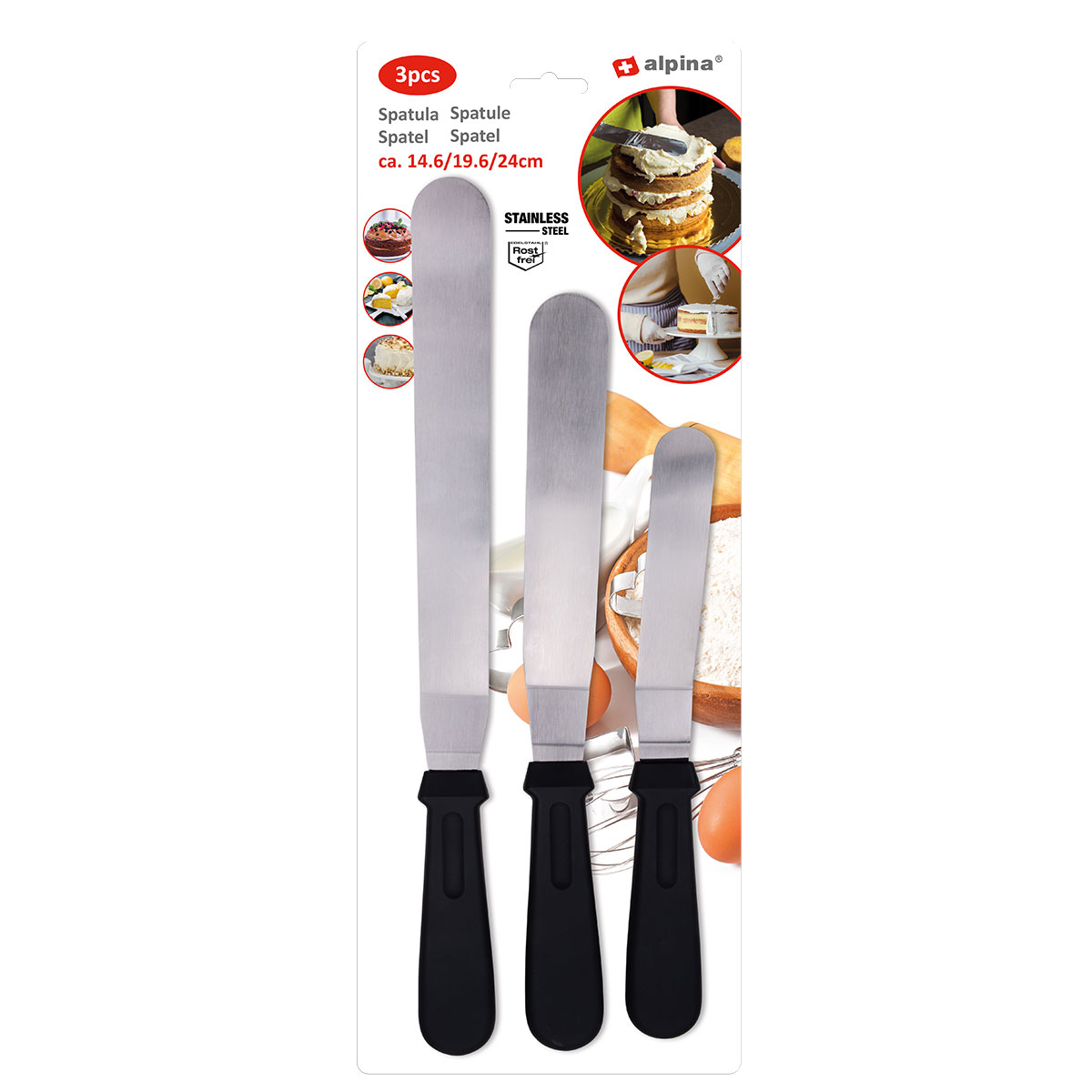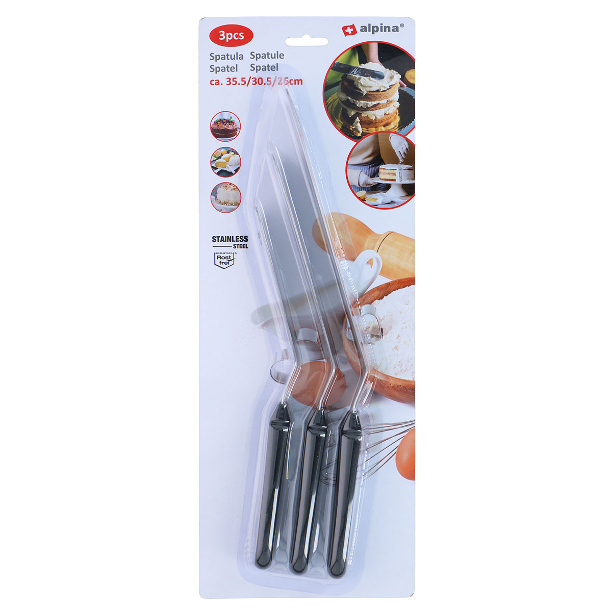 Σπαστές σπάτουλες ζαχαροπλαστικής παλέτα σετ 3 τεμάχια από την εταιρία Alpina. Είναι κατασκευασμένες από ανοξείδωτο ατσάλι σε ασημί χρώμα με μαύρες λαβές από πολυπροπυλένιο. Χρησιμεύουν για να απλώνετε ομοιόμορφα στα γλυκά σας κρέμες, σαντιγί, σοκολάτα κλπ. Μπορούν να χρησιμοποιηθούν για τη μεταφορά και το διαχωρισμό των βάσεων ζύμης.
