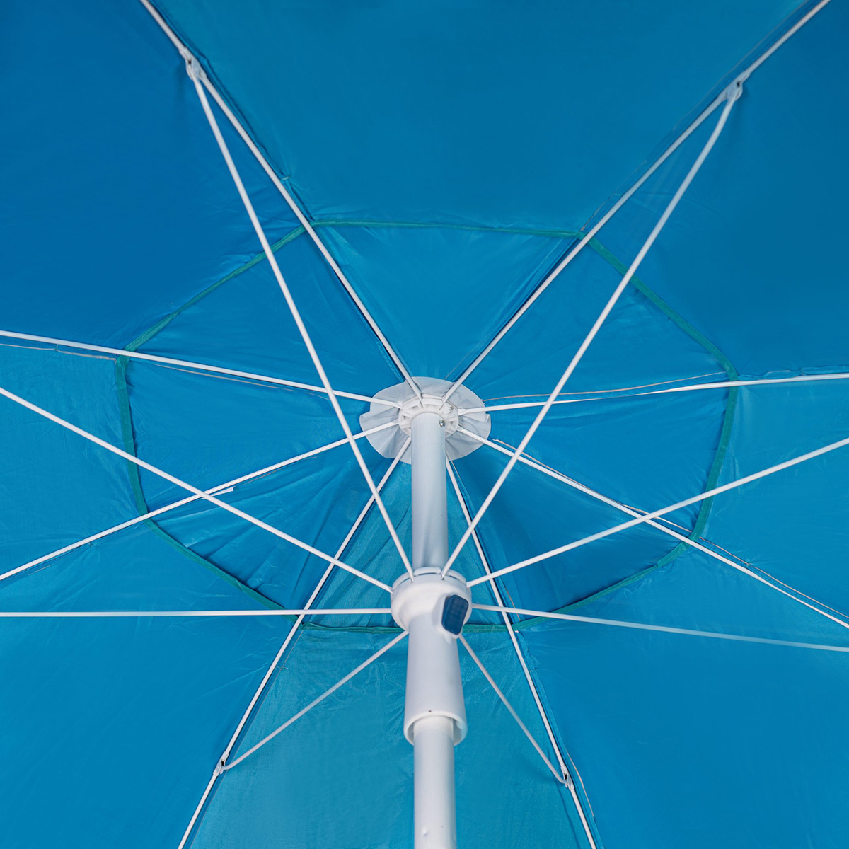 Ομπρέλα παραλίας από την εταιρεία Campo, σε ασημί και γαλάζιο χρώμα. Έχει καμπυλότητα 200εκ. και διάμετρο 175εκ., σχεδιασμένη για μέγιστη σταθερότητα και αντηλιακή προστασία UPF 50+. Το ύφασμα είναι polyester 210D Oxford με PU & Silver Coating, το οποίο εξασφαλίζει αδιαβροχοποίηση και υψηλή αντοχή στην ηλιακή ακτινοβολία και τον αποχρωματισμό. Ο σκελετός είναι κατασκευασμένος από κράμα σιδήρου με ηλεκτροστατική βαφή, προσφέρει στιβαρότητα και αντιδιαβρωτική προστασία. Ο αεραγωγός επιτρέπει την ομαλή ροή του αέρα, μειώνοντας τον κίνδυνο ανατροπής. Είναι σπαστή, με ρυθμιζόμενη κλίση ανάλογα με τον ήλιο και τον άνεμο. Διαθέτει 8 μεταλλικές ακτίνες με διάμετρο Φ4mm, που προσφέρουν ενισχυμένη ευκαμψία και ανθεκτικότητα στον άνεμο, ενώ τα πλαστικά καλύμματα στις άκρες προστατεύουν από τραυματισμούς. Βάρος Ομπρέλας: 2.4kg