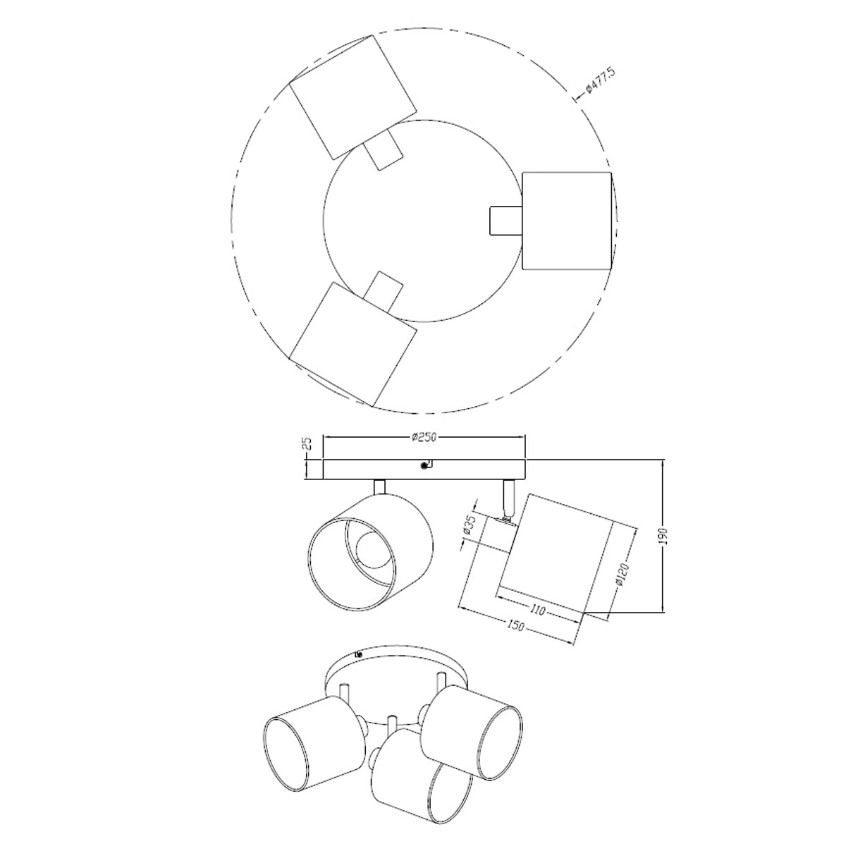 • Τεμάχια: 1 Σποτ Οροφής Τρίφωτο Φ47.8εκ.x19εκ.Υ