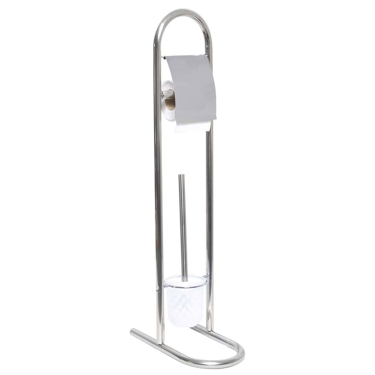 Σταντ για χαρτί υγείας με ενσωματωμένο πιγκάλ. Είναι κατασκευασμένο από ανοξείδωτο ατσάλι σε ασημί χρώμα και λευκές λεπτομέρειες. Ιδανικό για όσους δεν θέλουν να τρυπήσουν στον τοίχο ή τα πλακάκια του μπάνιου.