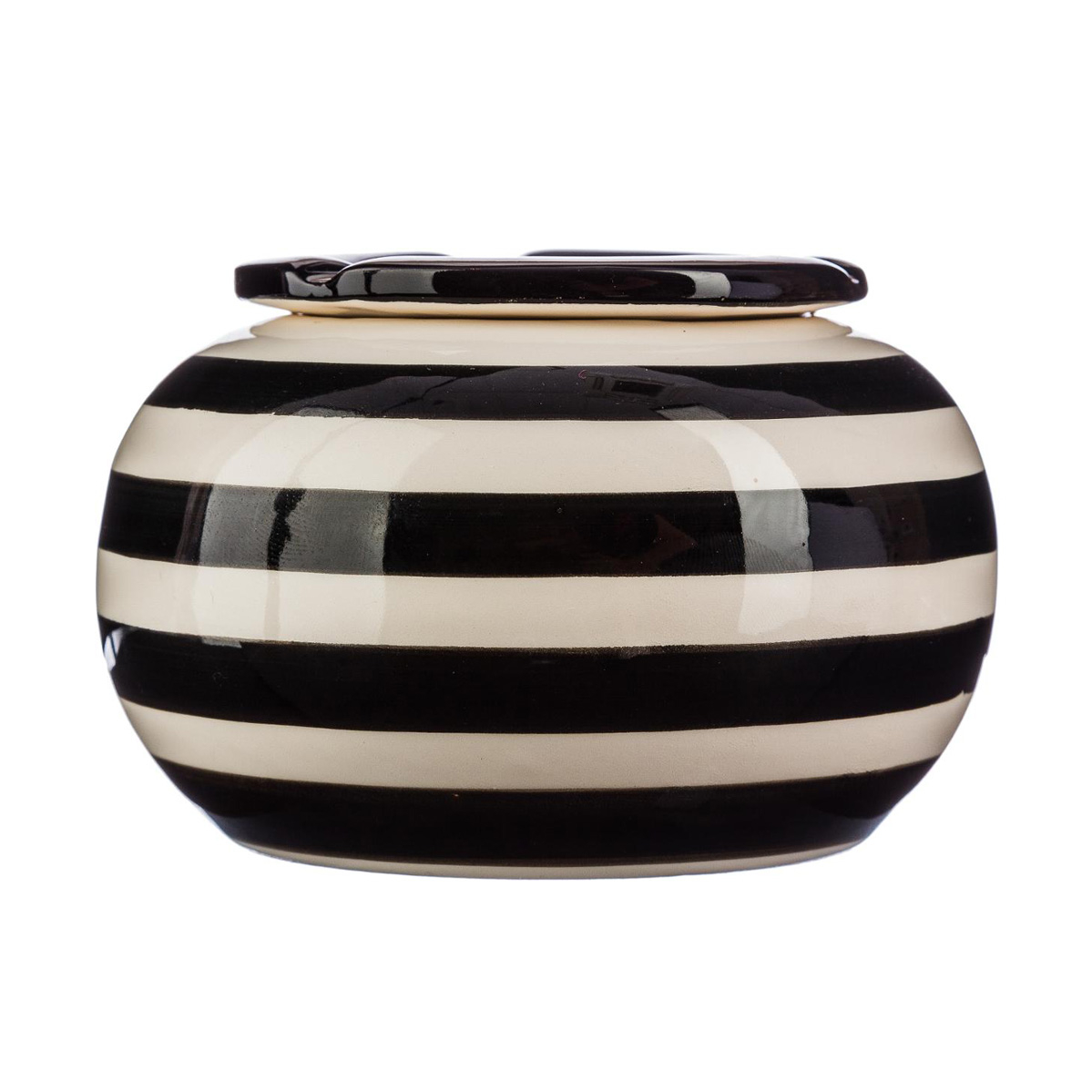 Τασάκι αντιανεμικό με ριγέ μαύρο-εκρού σχέδιο. Η στάχτη πέφτει στο δοχείο, ώστε να μην την παίρνει ο αέρας και να μην μυρίζει. Ιδανικό σταχτοδοχείο για τοποθέτηση στο σαλόνι, το γραφείο, την βεράντα ή όπου αλλού καπνίζετε εσείς ή οι καλεσμένοι σας.