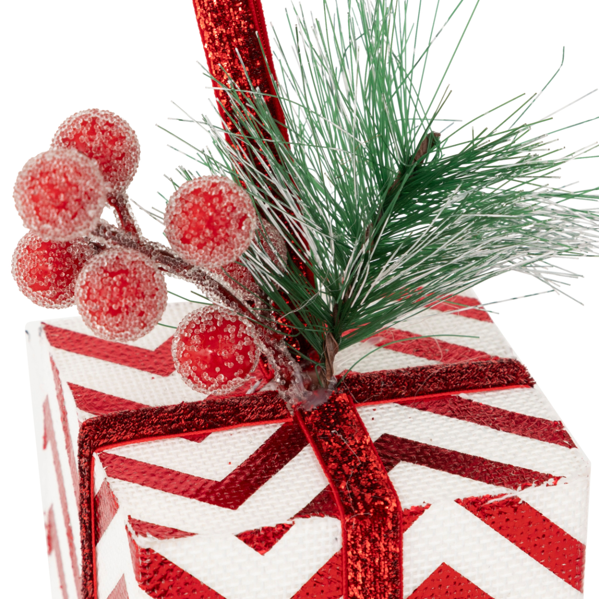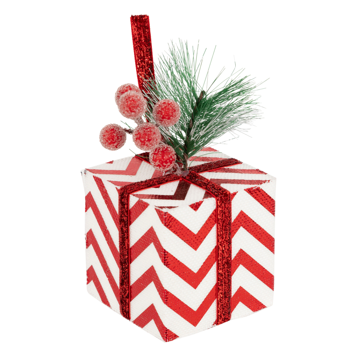 Χριστουγεννιάτικο στολίδι με σχήμα κουτιού σε λευκό-κόκκινο χρώμα με πράσινες λεπτομέρειες. Διαθέτει διακοσμητικούς καρπούς και κλαδί στο πάνω μέρος. Είναι κατασκευασμένο από ανθεκτικό πλαστικό. Αναδείξτε τον στολισμό του χριστουγεννιάτικου δέντρου σας με στολίδια που εντυπωσιάζουν και ξεχωρίζουν.