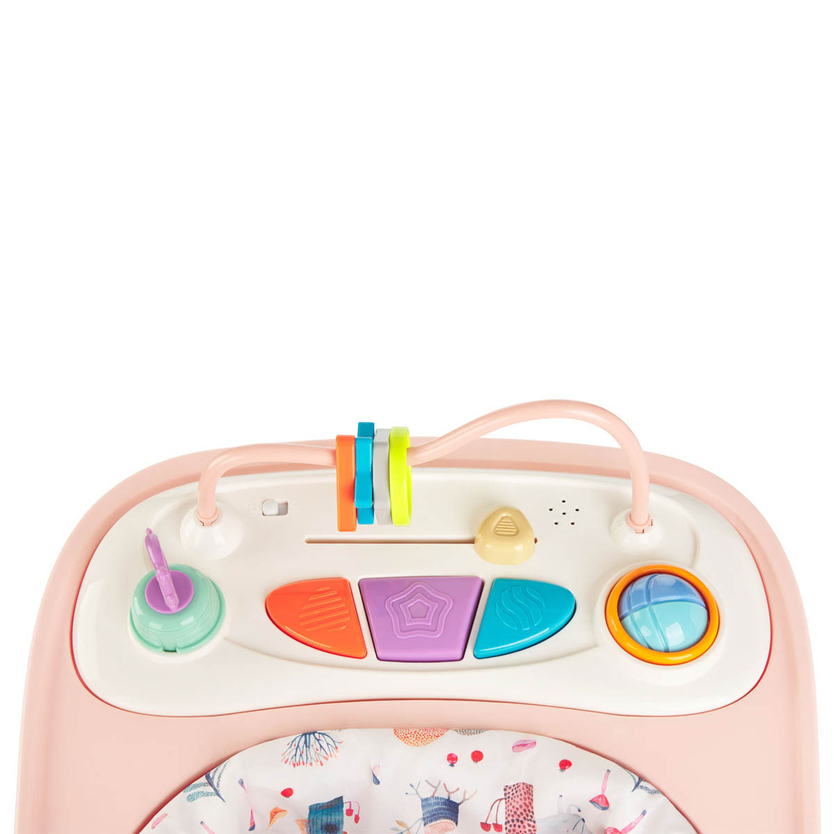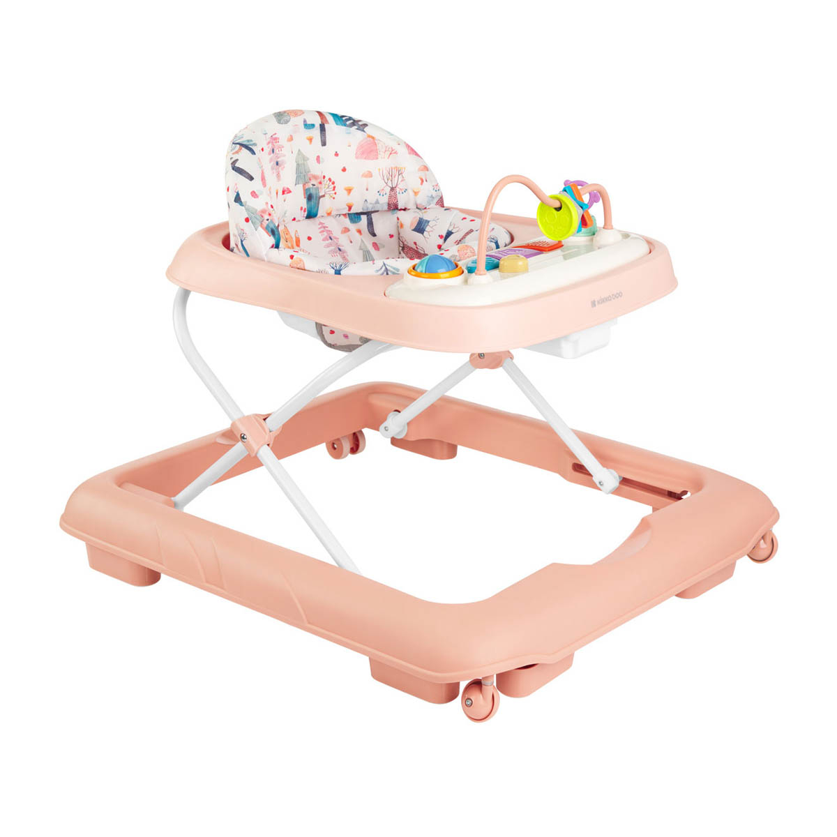 Στράτα της εταιρείας Kikka Boo. Έχει μεταλλικό σκελετό με πλαστικά μέρη σε σομόν χρώμα και πολύχρωμες λεπτομέρειες. Έχει 3 θέσεις ύψους για να προσαρμόζεται στο ύψος του παιδιού σας και μαλακό κάθισμα με πλάτη που στηρίζει το σώμα του. Διαθέτει 4 ροδάκια εκ των οποίων τα 2 έχουν δυνατότητα περιστροφής 360 μοίρες για να στρίβει προς οποιαδήποτε κατεύθυνση 6 στοπ σιλικόνης που προσφέρουν ασφάλεια. Διαθέτει αποσπώμενο πάνελ διαδραστικών παιχνιδιών που παράγουν μουσική και διασκεδάζουν το παιδί. Το πάνελ λειτουργεί με 2 μπαταρίες ΑΑ (δεν περιλαμβάνονται). Διπλώνει και καταλαμβάνει μικρό χώρο για να το αποθηκεύετε εύκολα. Κατάλληλο για παιδιά 6+ μηνών και μέχρι 12kg.