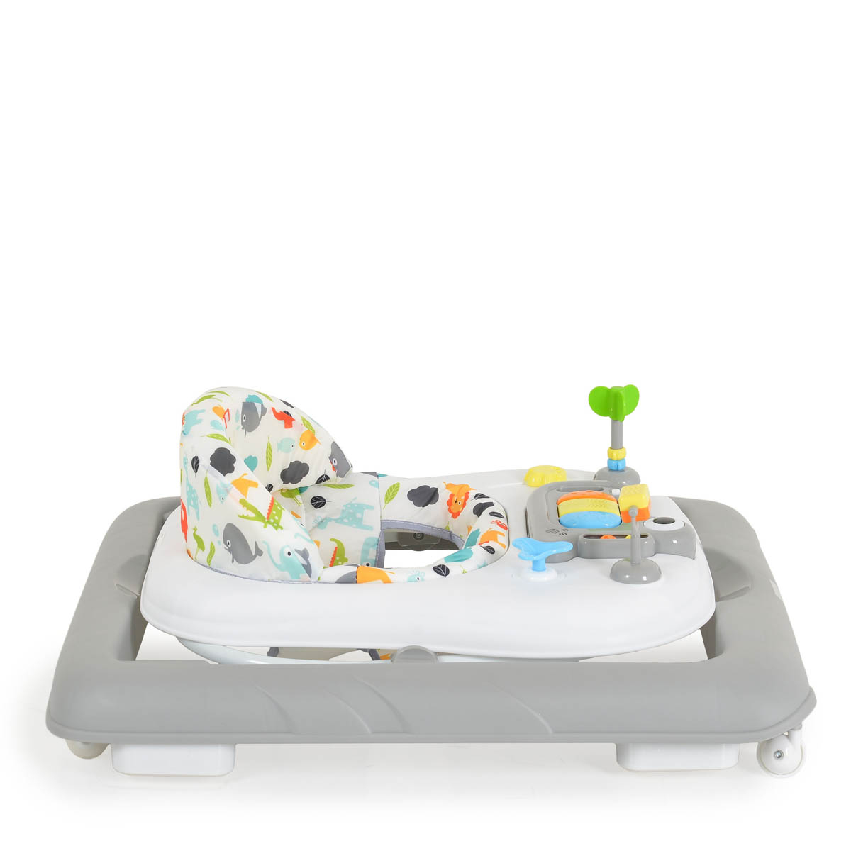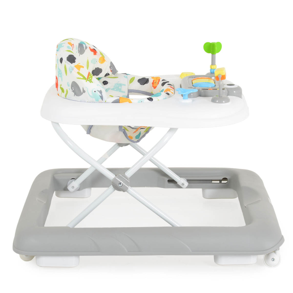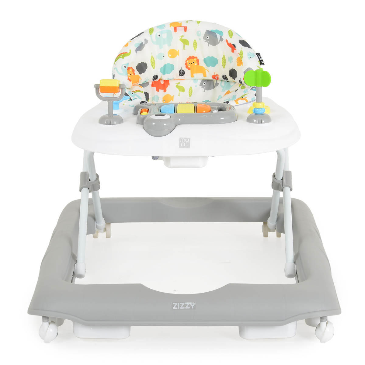 Στράτα σε γκρι χρώμα με πολύχρωμες λεπτομέρειες από την εταιρεία Moni. Το μαλακό κάθισμά του έχει ρυθμιζόμενο ύψος 3 θέσεων για μπορεί να προσαρμόζεται στο ύψος του παιδιού σας και τα ποδαράκια του να πατάνε καλά. Διαθέτει 4 ροδάκια με τα μπροστινά να έχουν δυνατότητα περιστροφής 360 μοίρες ώστε να το κινεί και να το κατευθύνει εύκολα. Εξοπλισμένο με φρένα σιλικόνης που κρατούν ασφαλές το μωρό. Στο μπροστινό μέρος έχει διάφορα παιχνίδια που παράγουν ήχους, μελωδίες και φωτάκια που διασκεδάζουν το παιδί και συμβάλλουν στην ανάπτυξη των οπτικοακουστικών του δεξιοτήτων. Βάρος στράτας: 3.7 κιλά. Κατάλληλη για παιδιά 6+ μηνών και έως 12kg.