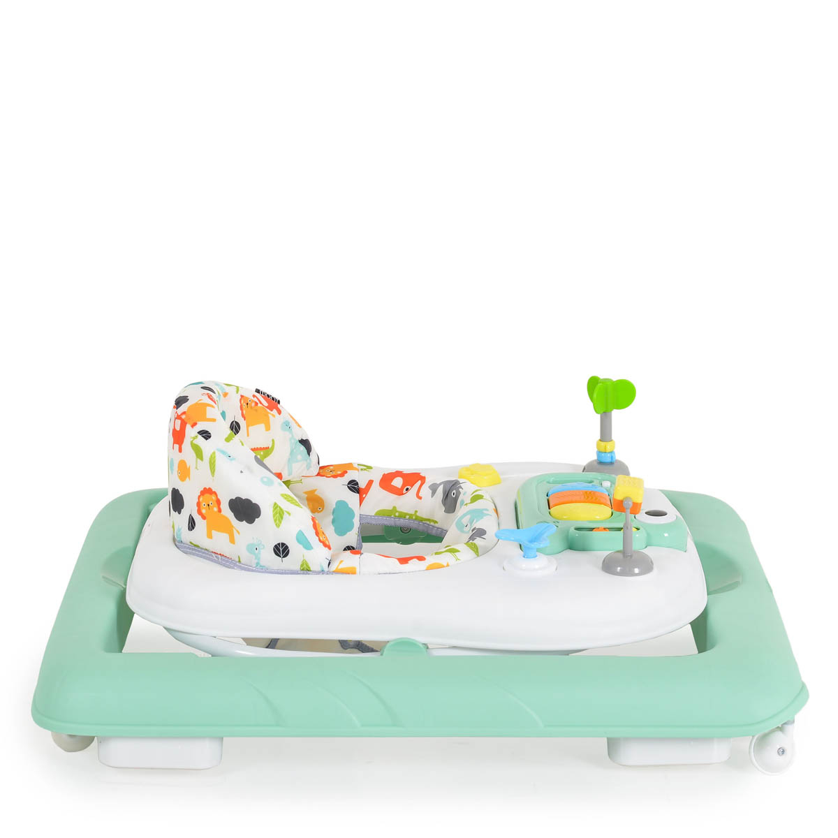 Στράτα σε βεραμάν-πολύχρωμες αποχρώσεις από την εταιρεία Moni. Το μαλακό κάθισμά του έχει ρυθμιζόμενο ύψος 3 θέσεων για μπορεί να προσαρμόζεται στο ύψος του παιδιού σας και τα ποδαράκια του να πατάνε καλά. Διαθέτει 4 ροδάκια με τα μπροστινά να έχουν δυνατότητα περιστροφής 360 μοίρες ώστε να το κινεί και να το κατευθύνει εύκολα. Εξοπλισμένο με φρένα σιλικόνης που κρατούν ασφαλές το μωρό. Στο μπροστινό μέρος έχει διάφορα παιχνίδια που παράγουν ήχους, μελωδίες και φωτάκια που διασκεδάζουν το παιδί και συμβάλλουν στην ανάπτυξη των οπτικοακουστικών του δεξιοτήτων. Βάρος στράτας: 3.7 κιλά. Κατάλληλη για παιδιά 6+ μηνών και έως 12kg.