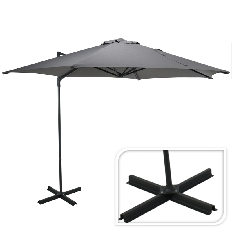 Κρεμαστή ομπρέλα κήπου με διάμετρο 2.7 μέτρα σε γκρι χρώμα. Είναι κατασκευασμένη από αδιαβροχοποιημένο ύφασμα από 100% polyester με δείκτη αντιηλιακής προστασίας 30+. Ο στιβαρός μεταλλικός σκελετός της τύπου μπανάνα σε συνδυασμό με την βάση σε σχήμα Χ, καθιστούν την ομπρέλα πολύ σταθερή.