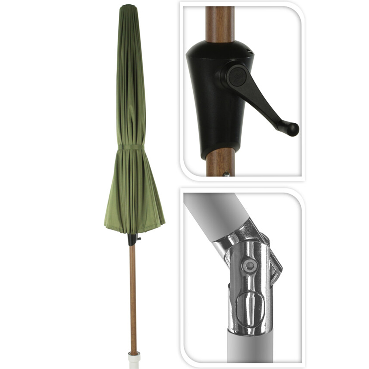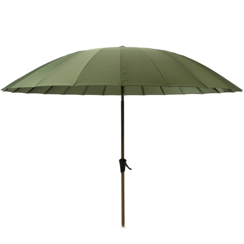 Ομπρέλα κήπου τύπου Shanghai με διάμετρο 2.8 μέτρα σε χακί χρώμα. Είναι κατασκευασμένη από αδιαβροχοποιημένο ύφασμα από 100% polyester. Διαθέτει σκελετό αλουμινίου με 24 ακτίνες, ο στύλος έχει εφέ ξύλου και είναι εξοπλισμένη με μηχανισμό στροφάλου για εύκολο δίπλωμα και ξεδίπλωμα. Είναι πτυσσόμενη και ξεδιπλούμενη με μανιβέλα. Μπορεί να πάρει κλίση για καλύτερη προστασία και σκιά. Δεν περιλαμβάνεται βάση.