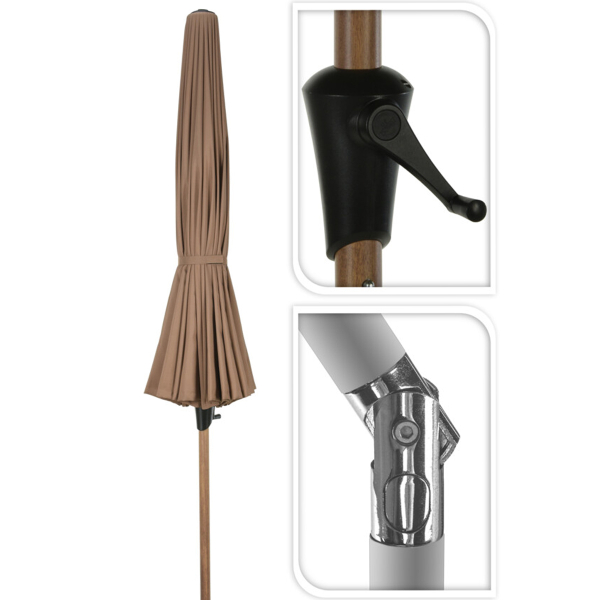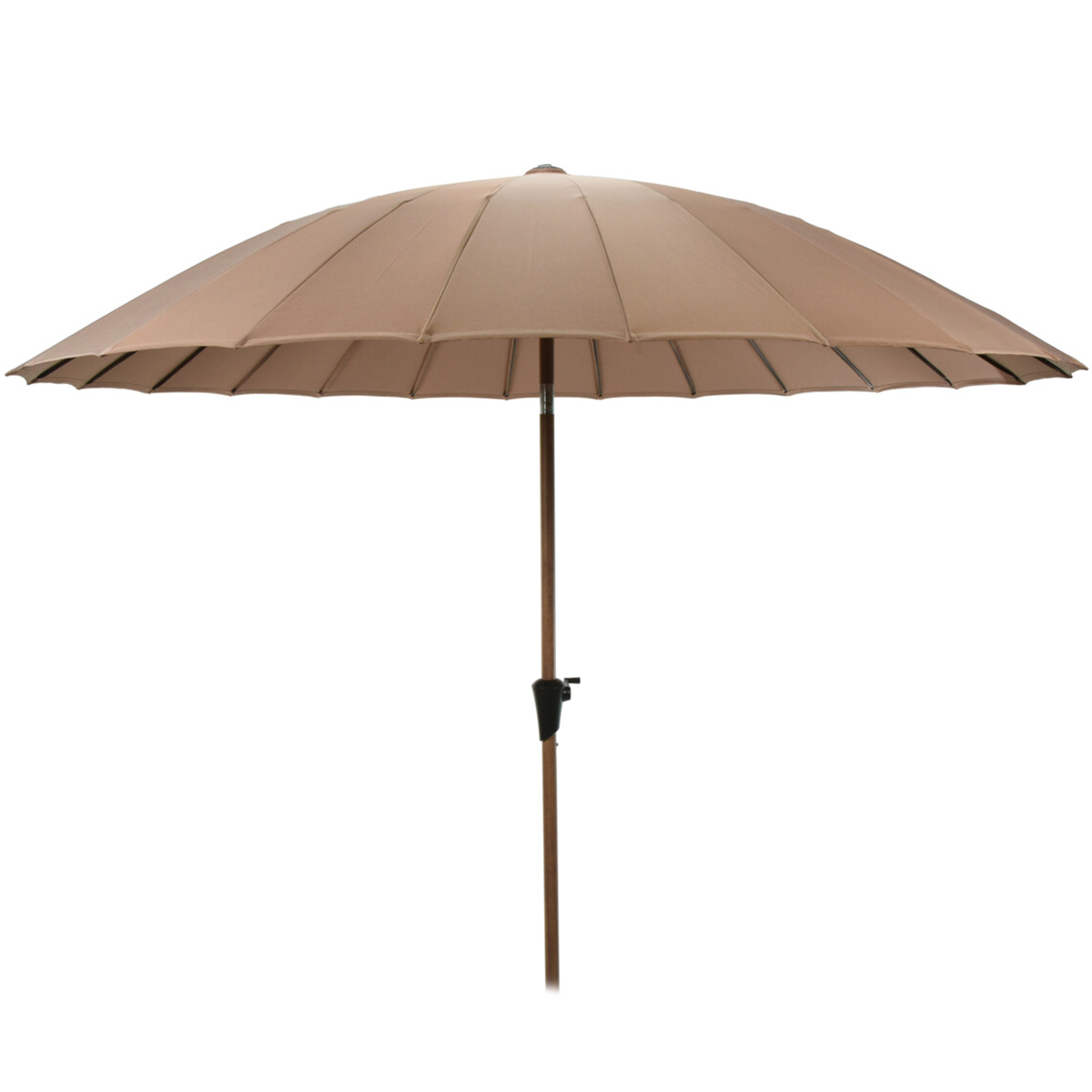 Ομπρέλα κήπου τύπου Shanghai με διάμετρο 2.8 μέτρα σε μπεζ χρώμα. Είναι κατασκευασμένη από αδιαβροχοποιημένο ύφασμα από 100% polyester. Διαθέτει σκελετό αλουμινίου με 24 ακτίνες, ο στύλος έχει εφέ ξύλου και είναι εξοπλισμένη με μηχανισμό στροφάλου για εύκολο δίπλωμα και ξεδίπλωμα. Είναι πτυσσόμενη και ξεδιπλούμενη με μανιβέλα. Μπορεί να πάρει κλίση για καλύτερη προστασία και σκιά. Δεν περιλαμβάνεται βάση.