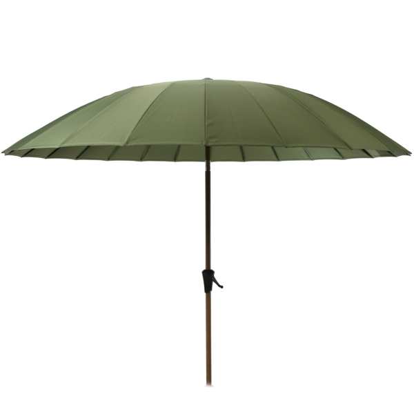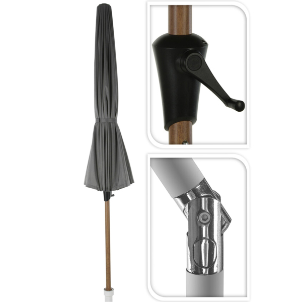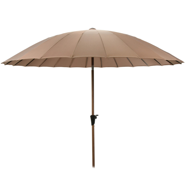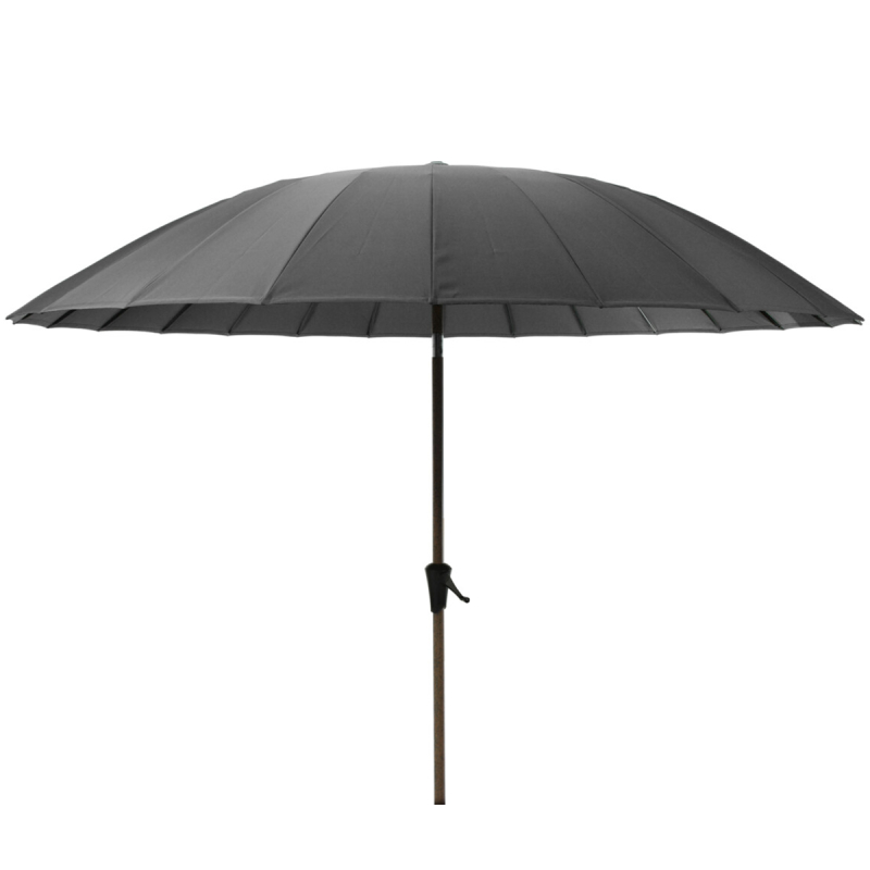 Ομπρέλα κήπου τύπου Shanghai με διάμετρο 2.8 μέτρα σε ανθρακί χρώμα. Είναι κατασκευασμένη από αδιαβροχοποιημένο ύφασμα από 100% polyester. Διαθέτει σκελετό αλουμινίου με 24 ακτίνες, ο στύλος έχει εφέ ξύλου και είναι εξοπλισμένη με μηχανισμό στροφάλου για εύκολο δίπλωμα και ξεδίπλωμα. Είναι πτυσσόμενη και ξεδιπλούμενη με μανιβέλα. Μπορεί να πάρει κλίση για καλύτερη προστασία και σκιά. Δεν περιλαμβάνεται βάση.