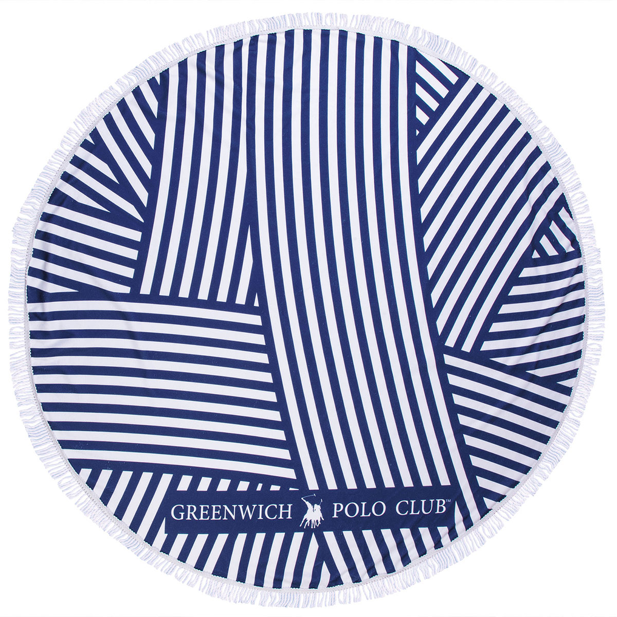 Στρογγυλή πετσέτα θαλάσσης από τον οίκο Greenwich Polo Club που προσφέρει ποιότητα, στυλ και πολυτέλεια. Έχει λευκό φόντο με μπλε λεπτομέρειες, μοντέρνο σχέδιο και το λογότυπο της εταιρίας. Διαθέτει περιμετρικά, διακοσμητικά κρόσια. Είναι κατασκευασμένη από 100% υποαλλεργικό microfiber με ύφανση 280 gsm. Μοναδική πετσέτα με ποιότητα και στυλ για τις εμφανίσεις σας στην παραλία.