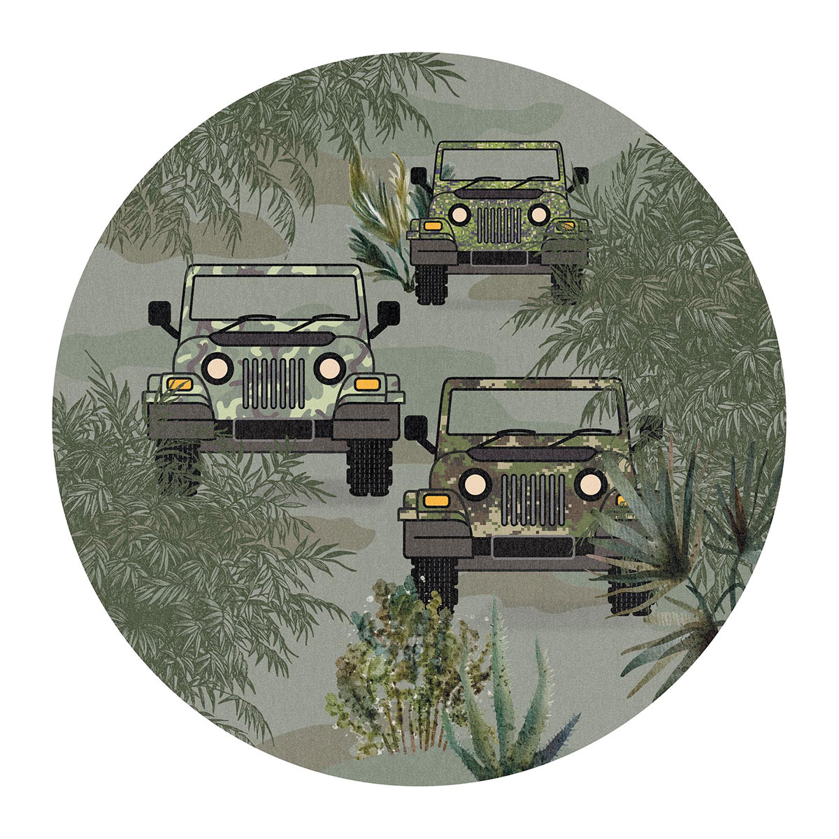 Ενιαία στρογγυλή ταπετσαρία τοίχου από την συλλογή Sofie & Junar της εταιρείας Behang Expresse με διάμετρο 150εκ. Έχει σχέδιο με αυτοκίνητα σε χακί-πράσινες αποχρώσεις. Πρόκειται για χάρτινη στρογγυλή φωτοταπετσαρία υψηλής ποιότητας και ιταλικής κατασκευής με Vlies - Non Woven υπόστρωμα. Η επιφάνειά της είναι λεία κατασκευασμένη από πολυτελές χαρτί ψηφιακής εκτύπωσης. Ιδανική για να τοποθετηθεί και στο βρεφικό ή παιδικό δωμάτιο δίνοντας μία παραμυθένια αίσθηση στο χώρο.