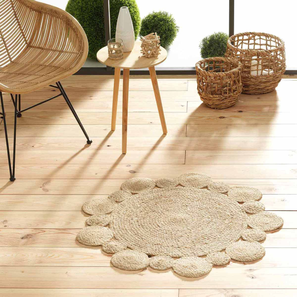 Ψάθινο στρογγυλό πατάκι από την εταιρεία Rythmos σε μπεζ χρώμα και διάτρητο σχέδιο. Η σύνθεσή του από 100% γιούτα το καθιστά οικολογικό και ανθεκτικό. Τοποθετήστε το σε όποιον χώρο του σπιτιού σας ταιριάζει.