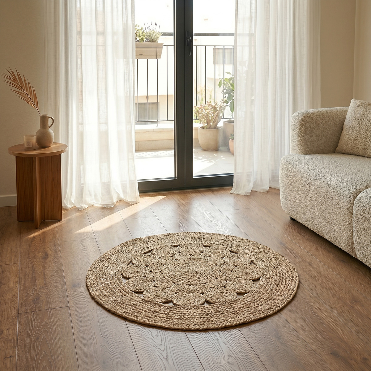Στρογγυλό πατάκι με διάμετρο 80εκ. από την σειρά Flora της εταιρείας Ravelia. Έχει μοντέρνο ύφος. Είναι κατασκευασμένο από 100% φυσική γιούτα σε μπεζ χρώμα. Το βάρος του είναι 3300gsm. Έχει αντιολισθητικό υπόστρωμα κατασκευασμένο από latex. Η ψάθινη υφή και η σύνθεσή του το καθιστούν ιδανικό για χρήση όλο τον χρόνο. Ιδανικό για να ταιριάξει σε οποιονδήποτε χώρο του σπιτιού σας. Συνδυάστε το με τα χαλιά της ίδιας σειράς στις υπόλοιπες διαστάσεις για ένα αρμονικό και ολοκληρωμένο αποτέλεσμα.