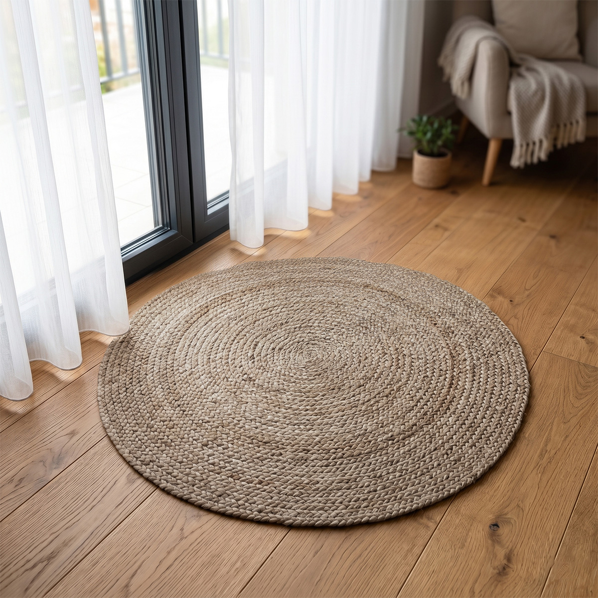 Στρογγυλό καλοκαιρινό μηχανοποίητο χαλί με διάμετρο 100εκ. από την σειρά Ojo της εταιρείας Ravelia. Έχει μοντέρνο σχέδιο πλεγμένο σε πλεξούδα. Είναι κατασκευασμένο από 100% φυσική γιούτα σε γκρι. Το βάρος του είναι 2000gsm. Η ψάθινη υφή και η σύνθεσή του το καθιστούν ιδανικό για χρήση όλο τον χρόνο. Μια κομψή και πρακτική επιλογή για όλους τους χώρους του σπιτιού, που προσθέτει φυσικό στυλ και διαχρονική αισθητική. Συνδυάστε το με τα χαλιά της ίδιας σειράς στις υπόλοιπες διαστάσεις για ένα αρμονικό και ολοκληρωμένο αποτέλεσμα.