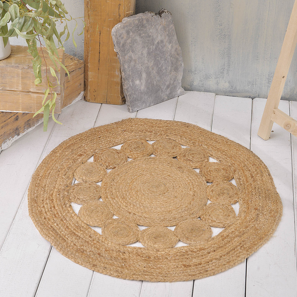Ψάθινο στρογγυλό χαλί από την εταιρεία Rythmos σε μπεζ χρώμα και διάτρητο σχέδιο. Η σύνθεσή του από 100% γιούτα το καθιστά οικολογικό και ανθεκτικό. Τοποθετήστε το σε όποιον χώρο του σπιτιού σας ταιριάζει.