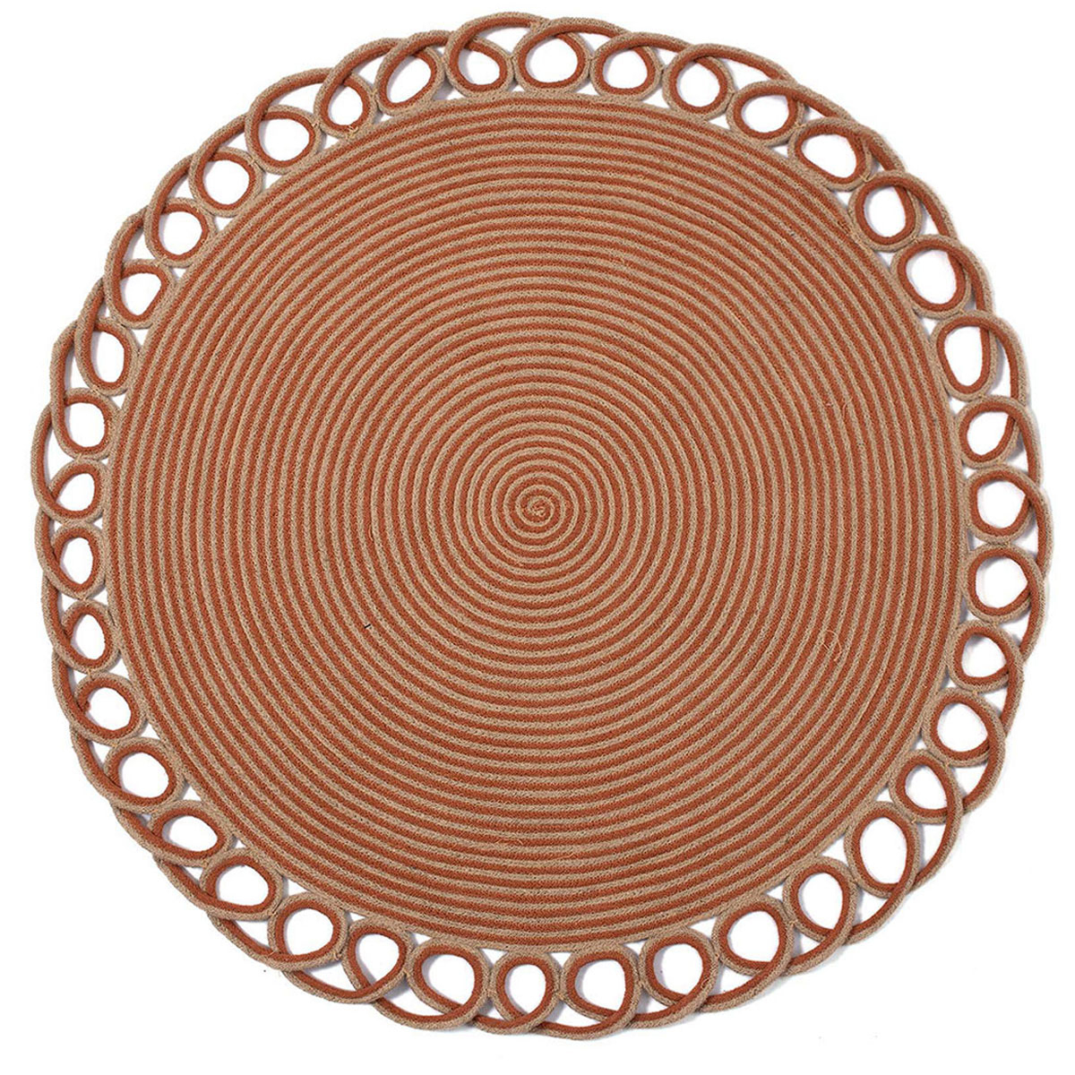 Ψάθινο στρογγυλό χαλί στο χρώμα της τερακότας από την εταιρεία Silk Fashion. Είναι κατασκευασμένο από 100% φυσική γιούτα. Είναι ιδανικό για τους καλοκαιρινούς μήνες. Μπορεί να τοποθετηθεί σε κάθε γωνιά του σπιτιού σας αναβαθμίζοντας την αισθητική του.