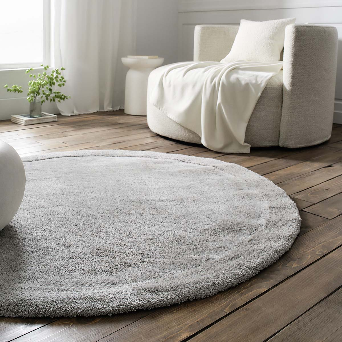 Στρογγυλό χαλί με διάμετρο 200εκ. από την εταιρεία Gofis Home σε γκρι χρώμα. Είναι κατασκευασμένο από μαλακά νήματα 90% micro yarn polyester και 10% βαμβάκι. Έχει αφράτο πέλος ύψους 25mm. Είναι αφράτο και αντιστατικό, επομένως δεν μαγνητίζονται χνούδια, μικροσωματίδια και σκόνη στην επιφάνεια του χαλιού. Θα δώσει μία πινελιά πολυτέλειας σε όλους τους χώρους του σπιτιού.