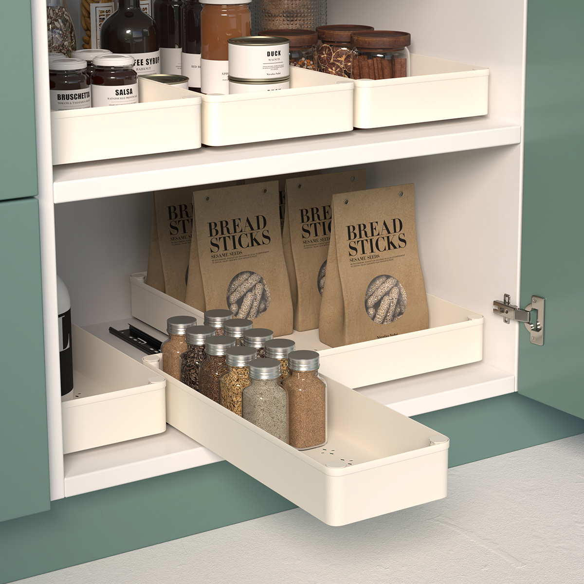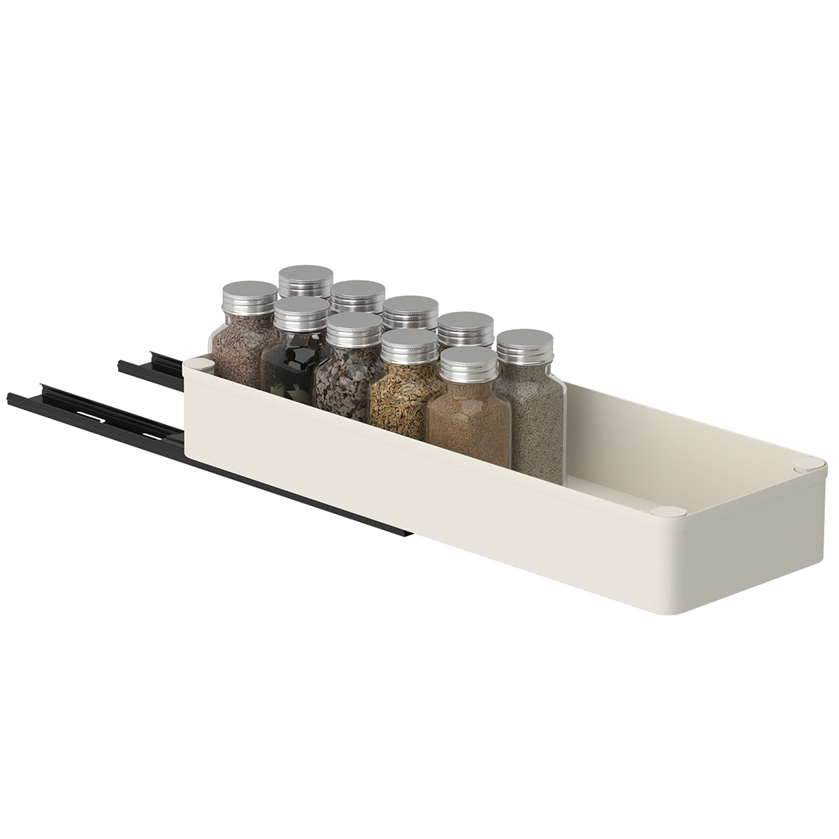 Συρόμενη θήκη αποθήκευσης κατασκευασμένη από πλαστικό υλικό (ABS) σε εκρού χρώμα. Μπορεί να τοποθετηθεί μέσα σε ντουλάπι στην κουζίνα, το μπάνιο και όπου αλλού είναι απαραίτητη δημιουργώντας πρόσθετο αποθηκευτικό χώρο με εύκολη πρόσβαση. Δεν χρειάζεται να τρυπήσετε το ντουλάπι καθώς διαθέτει αυτοκόλλητο στις ράγες για μεγαλύτερη σταθερότητα. Συνδυάστε τη με τα υπόλοιπα προϊόντα του ίδιου σετ για ένα ολοκληρωμένο αποτέλεσμα.