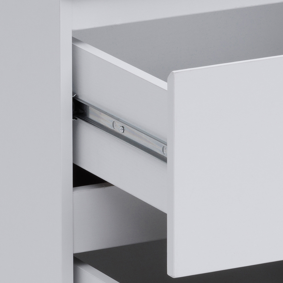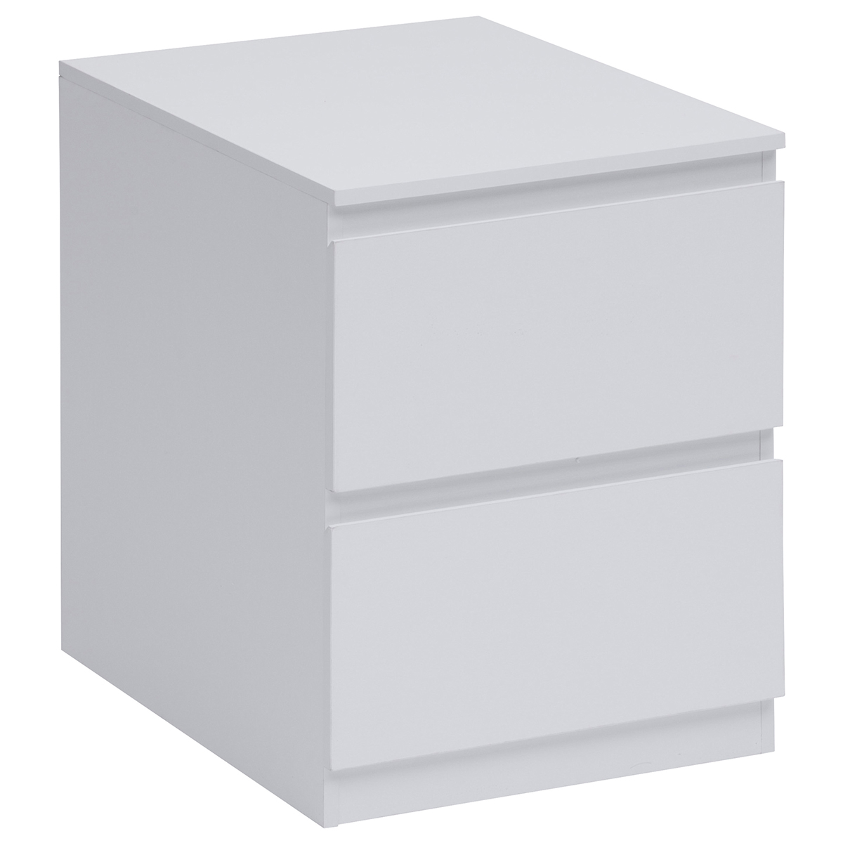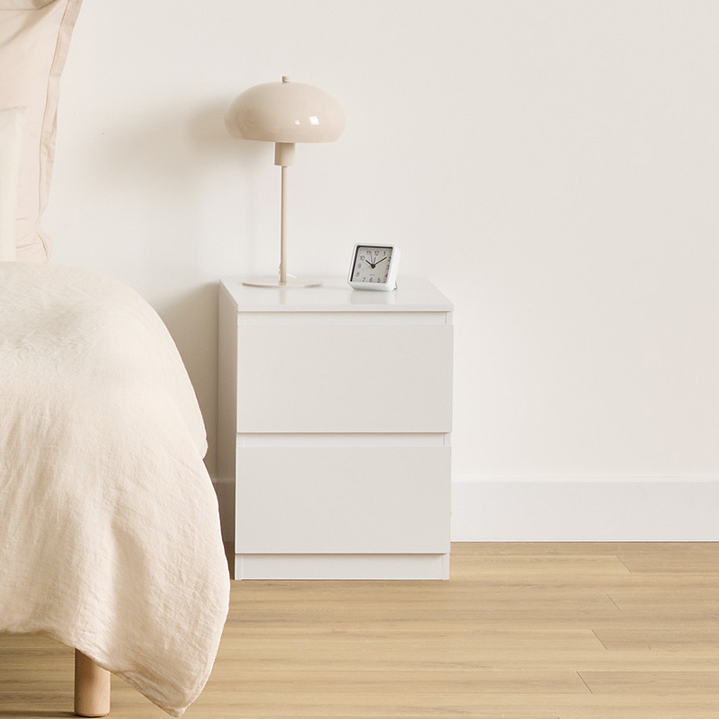Κομοδίνο με 2 συρτάρια που μπορείτε να τοποθετήσετε και να οργανώσετε τα πράγματά σας. Τοποθετήστε το δίπλα από το κρεβάτι σας σαν κομοδίνο. Είναι κατασκευασμένο από μοριοσανίδα σε λευκό χρώμα. Συνδυάστε το με τα υπόλοιπα προϊόντα στο ίδιο σετ για ένα ολοκληρωμένο αποτέλεσμα. *Το προϊόν έρχεται αμοντάριστο.*