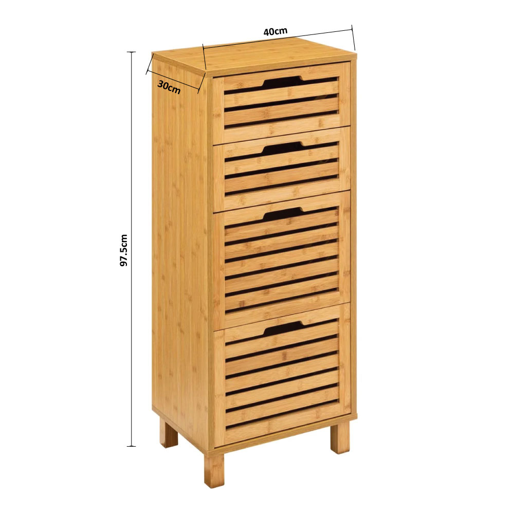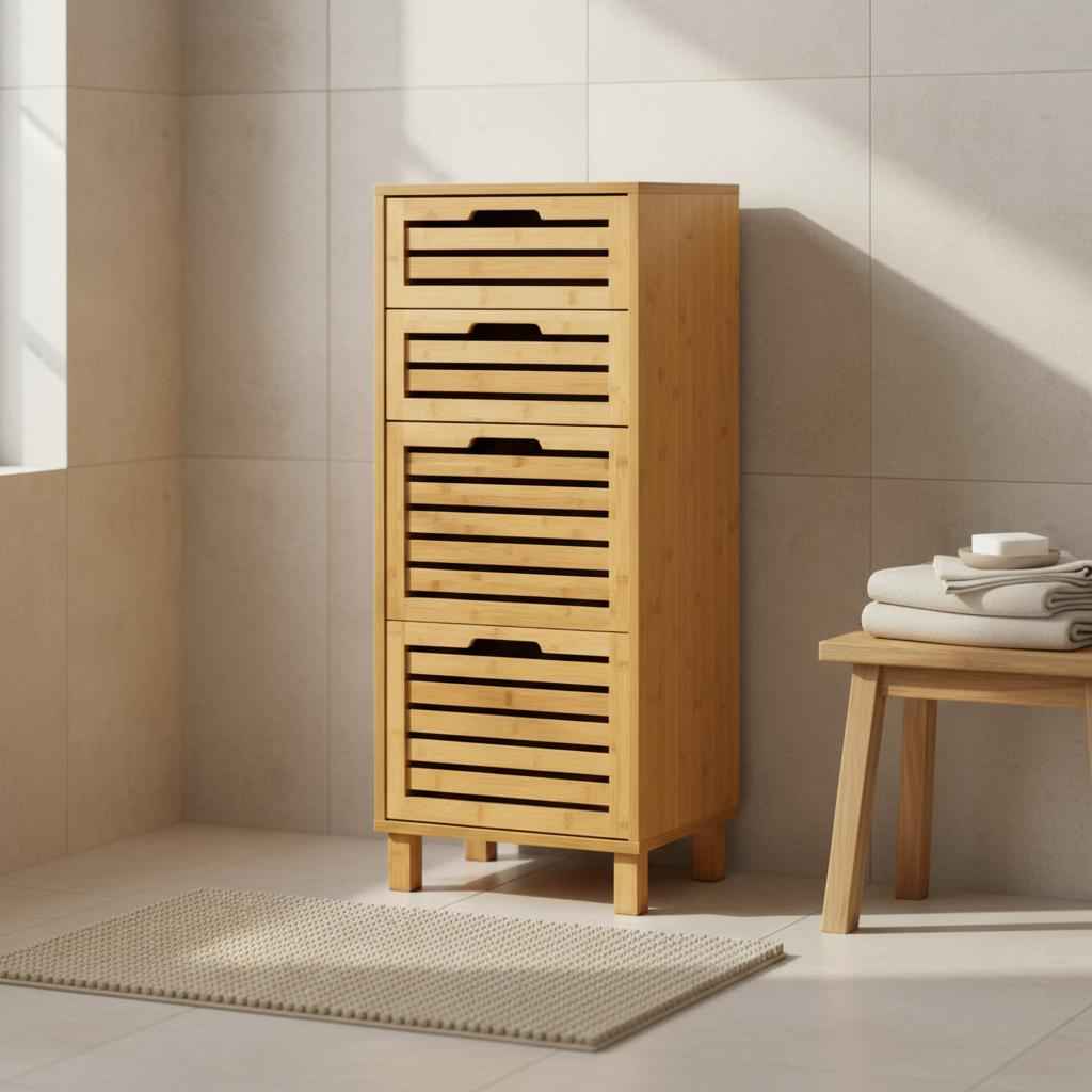 Έπιπλο μπάνιου - συρταριέρα κατασκευασμένο από ξύλο bamboo σε φυσική μπεζ απόχρωση. Διαθέτει 4 συρτάρια για να τοποθετήσετε μέσα καλλυντικά, πετσέτες ή ότι άλλο επιθυμείτε να οργανώσετε. Το προϊόν έρχεται αμοντάριστο και συναρμολογείται βάσει οδηγιών.