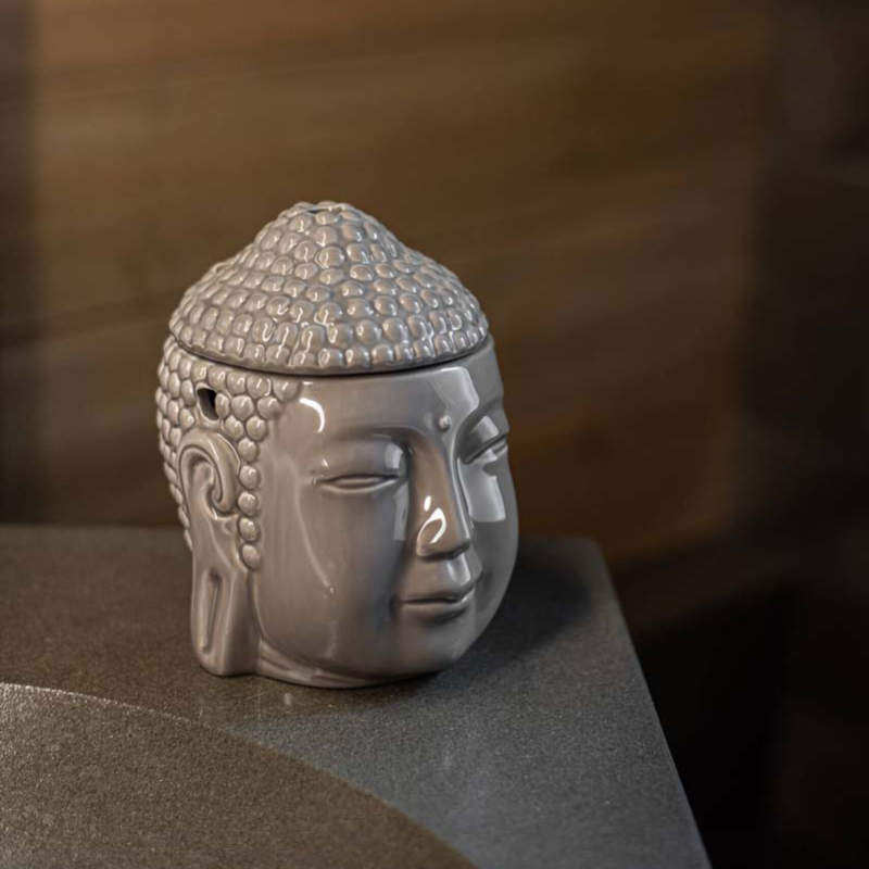 Συσκευή για αιθέρια έλαια με σχήμα Βούδα από την εταιρεία Scentchips by Corona di Fiori. Είναι κατασκευασμένη από κεραμικό υλικό σε γκρι χρώμα, με καπάκι στο πάνω μέρος. Ιδανική για αρωματικά έλαια αλλά και wax melts. Τοποθετήστε νερό στο πάνω μέρος του αρωματιστή και μερικές σταγόνες από το έλαιο σας. Σε περίπτωση που χρησιμοποιήσετε wax melts, δεν χρειάζεται να προσθέσετε νερό. Στη συνέχεια τοποθετήστε ένα ρεσώ στο κάτω μέρος. Η επίστρωση πορσελάνης του αρωματιστή έχει την ιδιότητα να θερμαίνεται σταδιακά με αποτέλεσμα να διαρκεί περισσότερο η μυρωδιά του ελαίου.