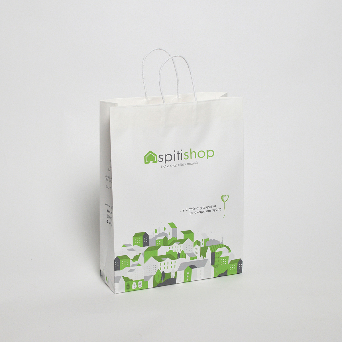 Τσάντα δώρου χάρτινη (32x40x10) σε λευκό χρώμα με τα αγαπημένα πράσινα σπιτάκια του Spitishop! Ιδανική για είδη όπως σεντονάκια κούνιας, παντόφλες, τραπεζομάντηλα, σετ μαχαιροπίρουνα, κορνίζες, πετσέτες θαλάσσης και αλλά προϊόντα ίδιου μεγέθους.
