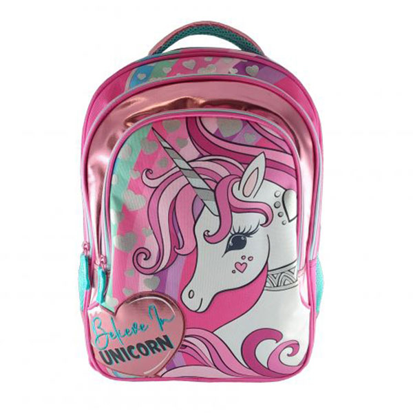 Σχολική τσάντα πλάτης δημοτικού της εταιρείας Graffiti σε ροζ-φούξια χρώμα με πολύχρωμες λεπτομέρειες και σχέδιο με μονόκερο. Έχει μεταλλιζέ ροζ λεπτομέρειες. Με 3 θήκες για βιβλία, τετράδια, κασετίνα και όλα τα απαραίτητα είδη γραφής για το σχολείο. Ιδανική για την καθημερινή ασφαλή, άνετη και εύκολη μεταφορά όλων των απαραίτητων σχολικών ειδών.