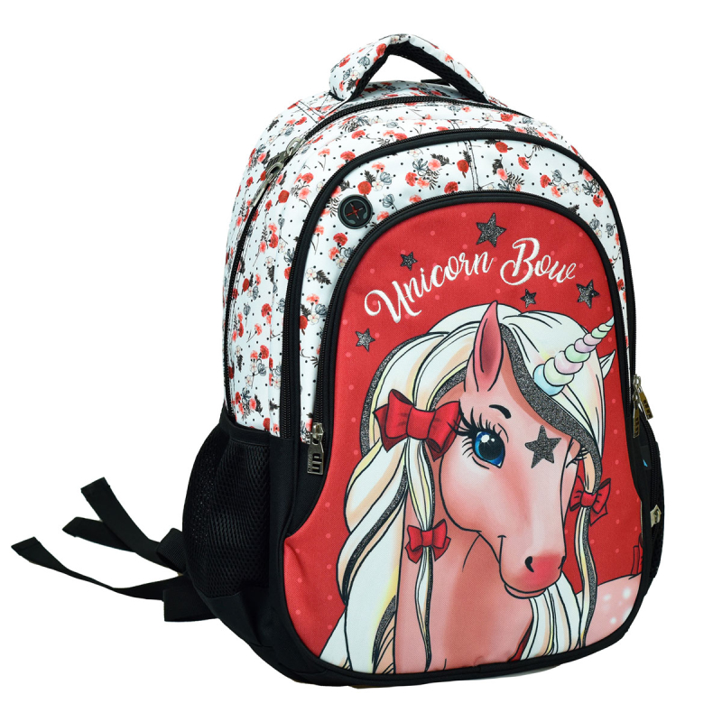 Σχολική τσάντα πλάτης δημοτικού σε λευκό-κόκκινο χρώμα με μονόκερο στο σχέδιο της εταιρείας Back Me Up. Με 3 θήκες για βιβλία, τετράδια, κασετίνα και όλα τα απαραίτητα είδη γραφής για το σχολείο. Ιδανική για την καθημερινή ασφαλή, άνετη και εύκολη μεταφορά όλων των απαραίτητων σχολικών ειδών.