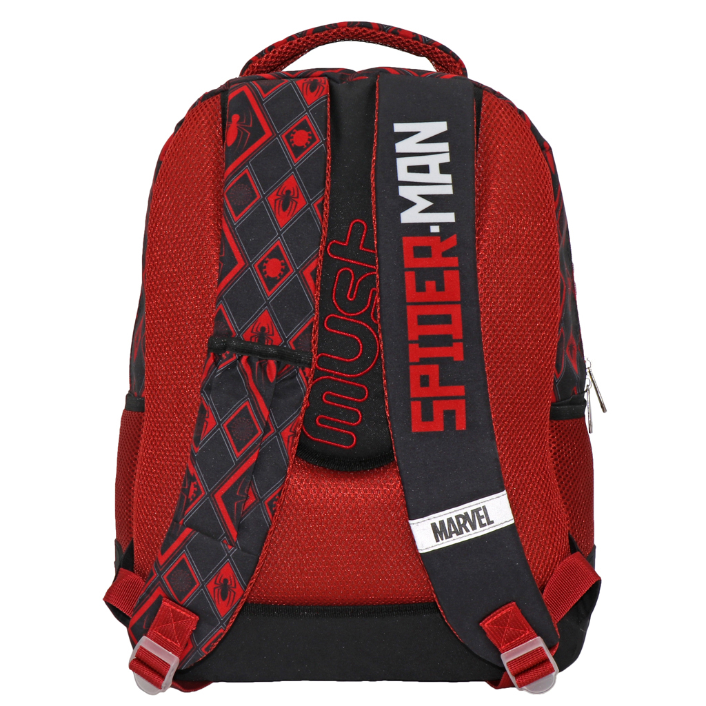 Σχολική τσάντα πλάτης δημοτικού σε μαύρο χρώμα με κόκκινες λεπτομέρειες και σχέδιο με τον ήρωα της Marvel Spiderman, από την εταιρεία Must. Με 3 θήκες για βιβλία, τετράδια, κασετίνα και όλα τα απαραίτητα είδη γραφής για το σχολείο. Ιδανική για την καθημερινή ασφαλή, άνετη και εύκολη μεταφορά όλων των απαραίτητων σχολικών ειδών.