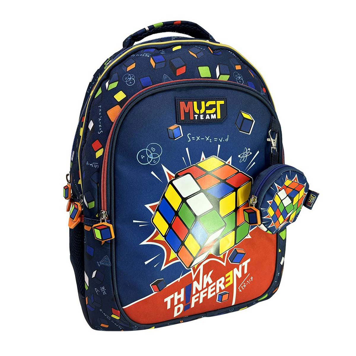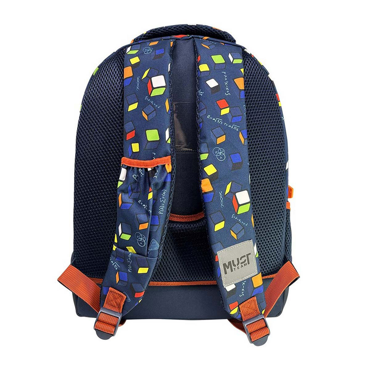 Σχολική τσάντα πλάτης δημοτικού σε μπλε χρώμα, με πολύχρωμες λεπτομέρειες και σχέδιο κύβο του Ρούμπικ με ανάγλυφη εκτύπωση από την εταιρεία Must. Με 3 θήκες για βιβλία, τετράδια, κασετίνα και όλα τα απαραίτητα είδη γραφής για το σχολείο. Ιδανική για την καθημερινή ασφαλή, άνετη και εύκολη μεταφορά όλων των απαραίτητων σχολικών ειδών.